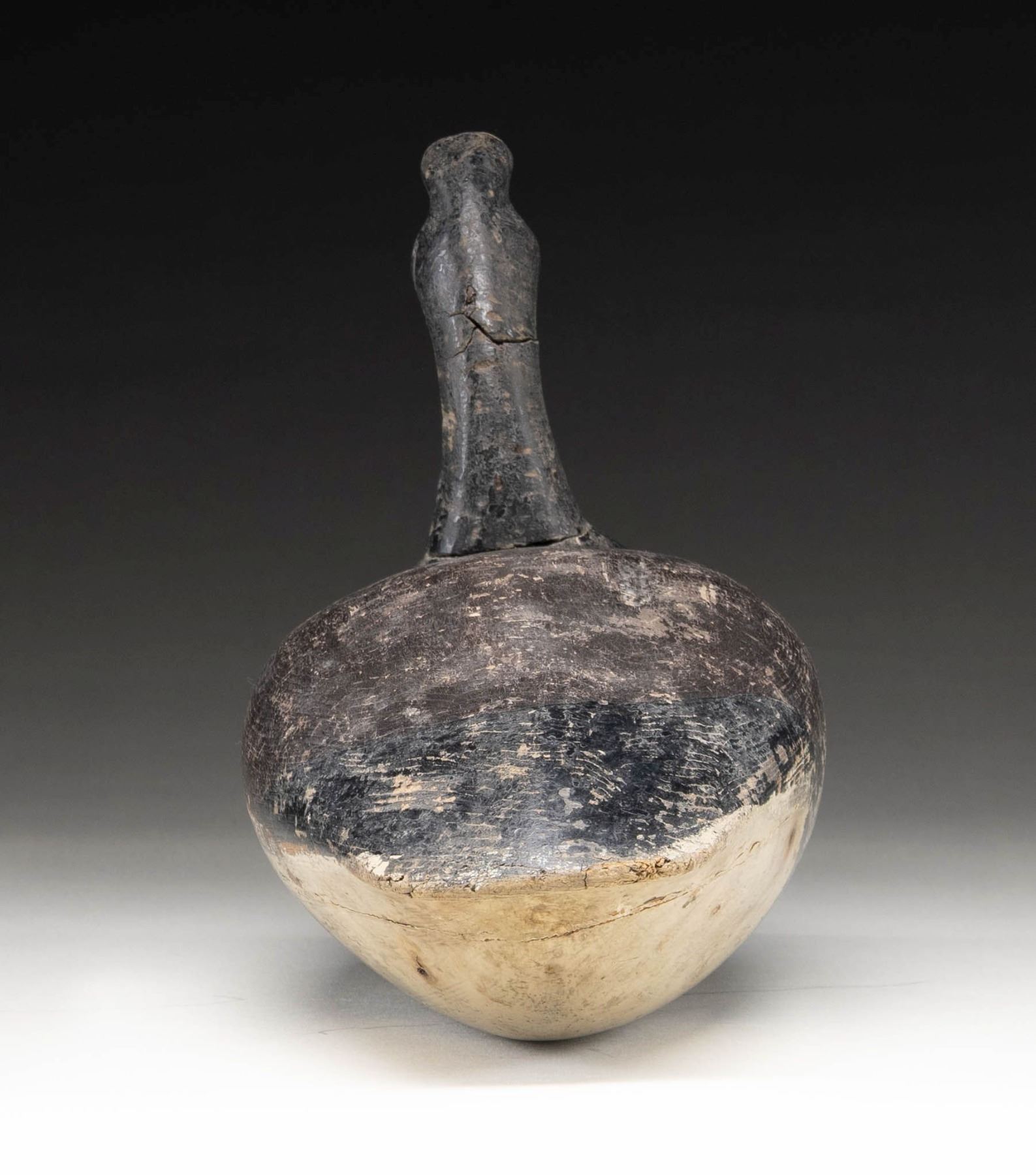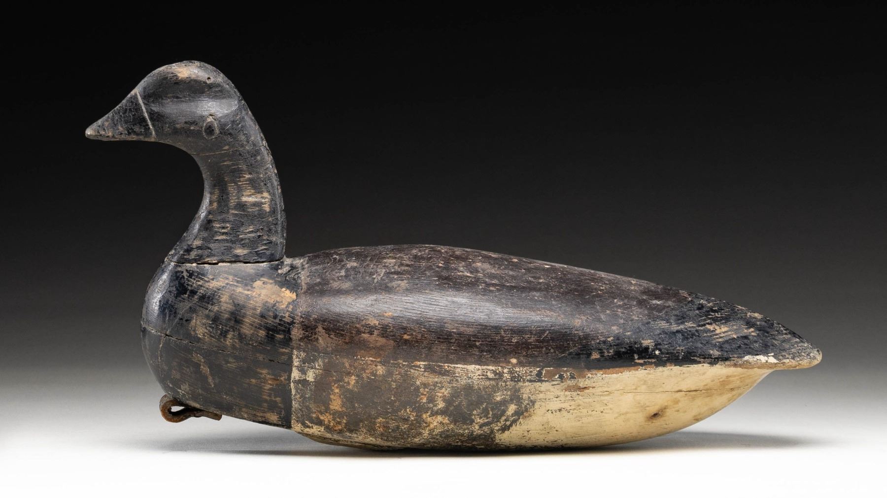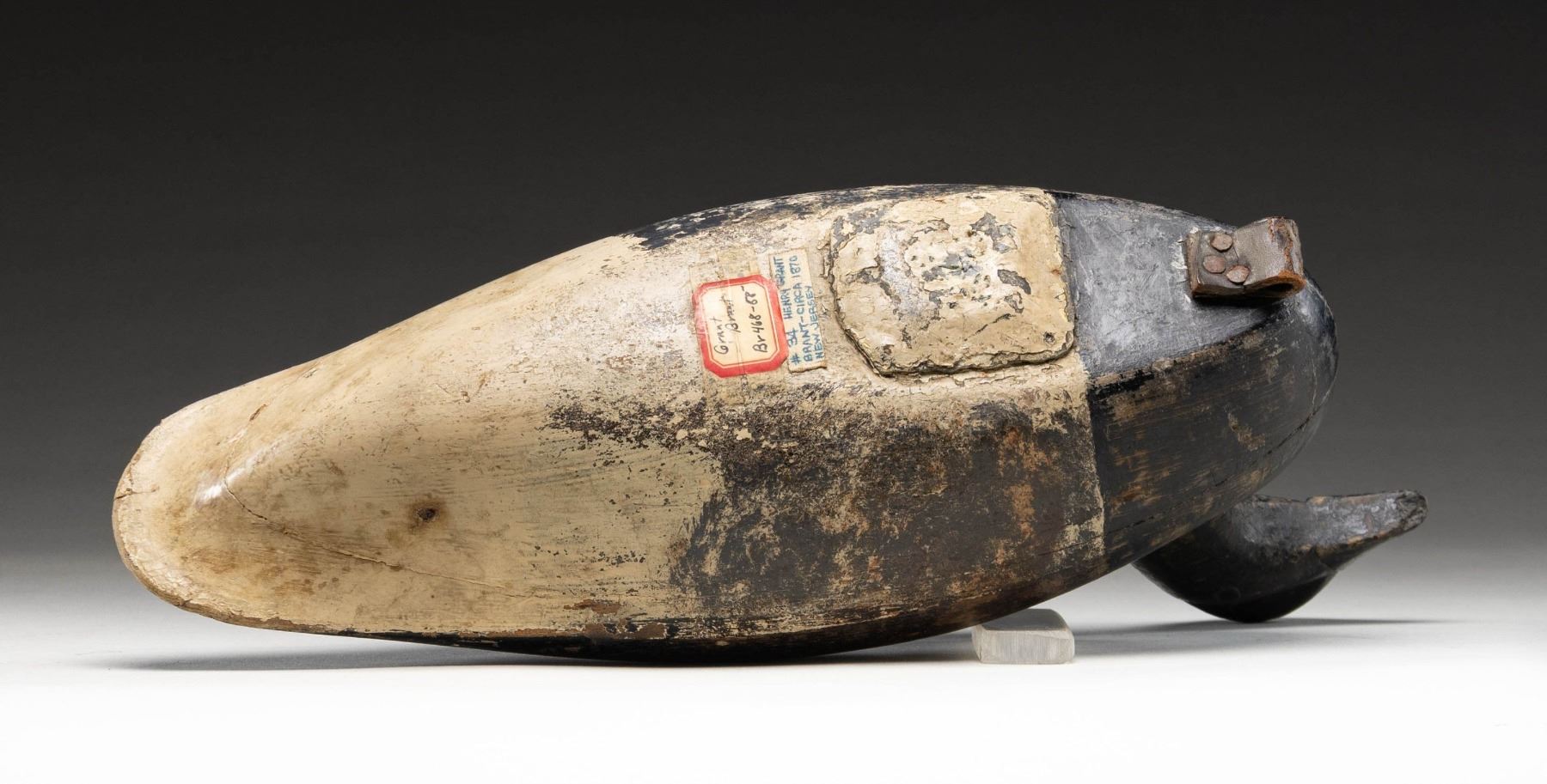 Henry Grant worked in Barngat, NJ from the early 1880's until his death in 1924. This 2 piece body decoy measures 19" and has old collection sticker on bottom "#34 HENRY GRANT" "BRANT - CIRCA 1870" "NEW JERSEY". CONDITION: good. Paint appears original; crack through neck (not repaired). Appears to have original weight and later leather loop. PROVENANCE: From the Private Collection of Berrien Moore III. (02-25872-7/MGM). $300-1,000.