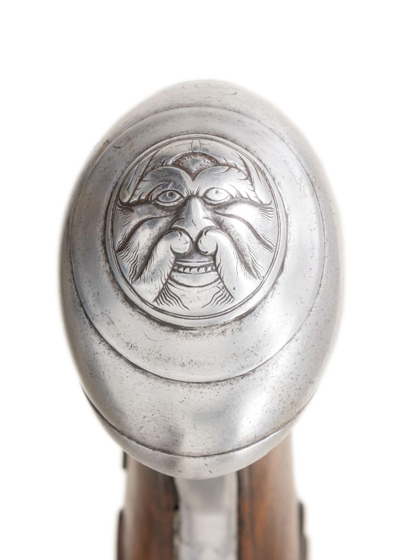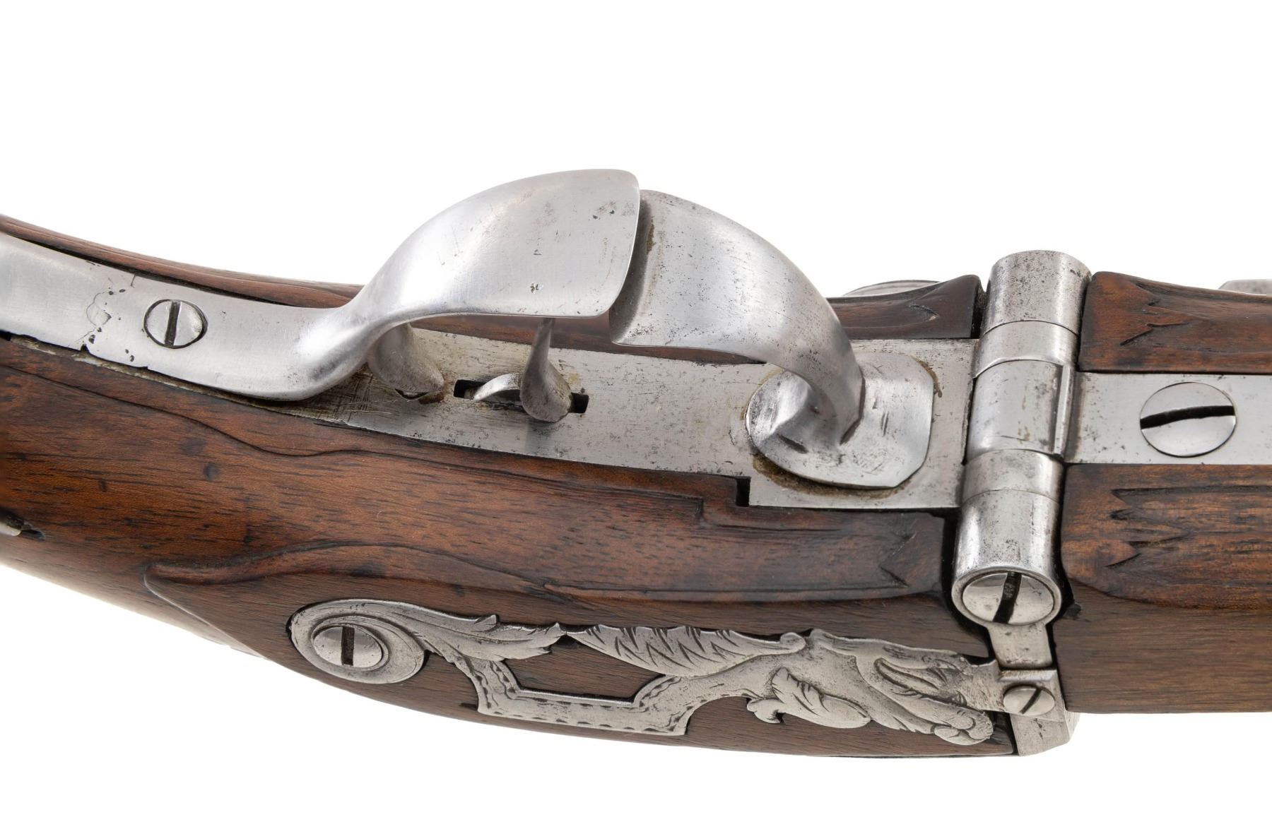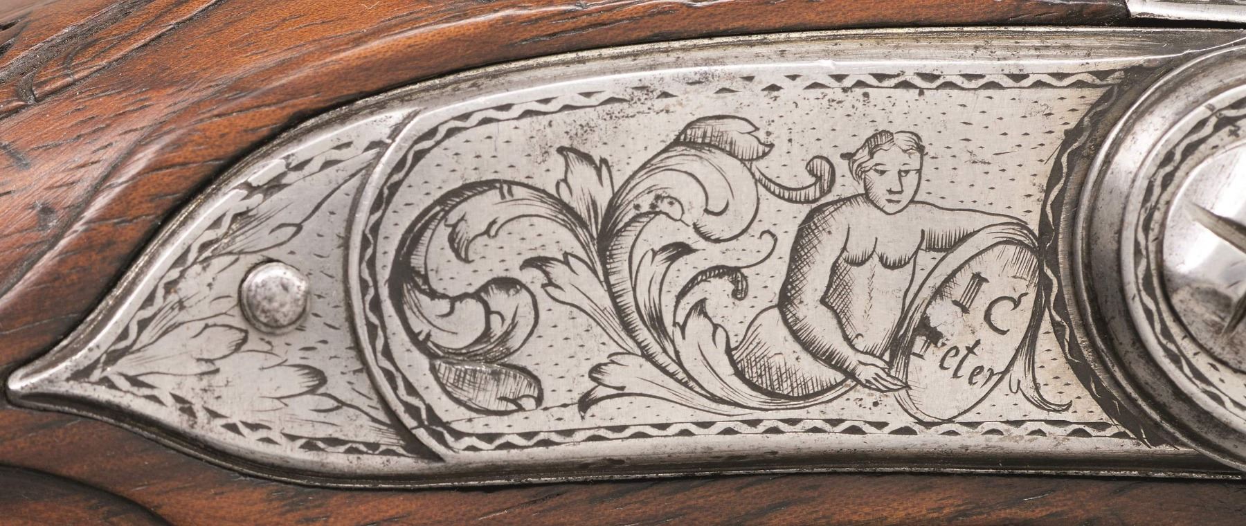 JOHANN CHRISTOPH PETER. Cal. 54 (rifled with 8 deep grooves). S# NSN. The 14" tapered round barrel with short octagonal breech section has raised carved acanthus decoration behind raised top rib and in front of breech. Tip down breech action has split trigger guard front portion being the push forward barrel latch. Front part of lock is attached to removable breech area. Back spring lock with chamfered plate is fitted with serpentine cock, inset faceted pan, unbridled friction frizzen and well filed feather spring with foliate finial. Back portion of lock is engraved with what appears to be a mermaid holding a shield inscribed with the maker's name "IC" "Peter" (working in Karlsbad Bohemia Ca. 1700-38). Neck of cock is raised carved with sea monsters head having scrolls emanating from its mouth. European walnut stock with large knobbed grip has steel grip cap with long side spurs adorned with a grotesque face at tip. Sideplate has single piercing and appears to be decorated with an animal's head and some foliate scrolls. Raised mouldings surround major parts which are accented by relief carved scrolls behind barrel tang and in front of hinge on fore part. Front portion of stock extends to muzzle and is pinned to barrel. Old walnut ramrod with horn tip mounts through single faceted pipe with matching thimble which is engraved "23". UNATTACHED ACCESSORIES: photocopy of online auction listing of this gun with handwritten notation $9,234. CONDITION: good as refinished. All metal cleaned to pewter gray with some scattered pin prick pitting. Trigger guard tang shows a repair. Stock refinished with oil has some subsequent marks. Carving is somewhat softened. Bore is fair; dark in grooves. Mechanically good. (01-26941/MGM). ANTIQUE. $5,000-7,000.