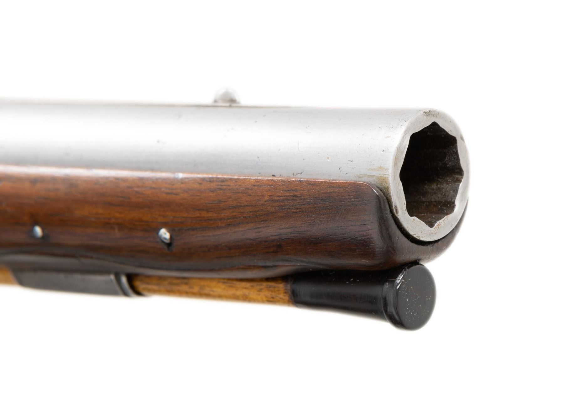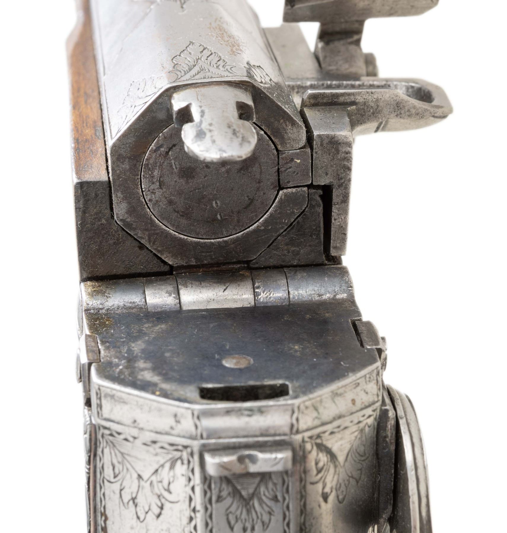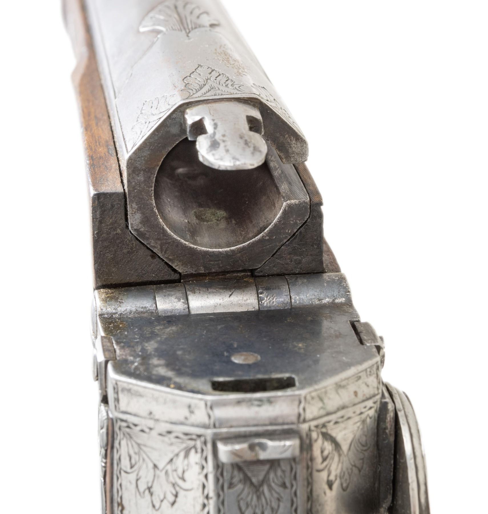 JOHANN CHRISTOPH PETER. Cal. 54 (rifled with 8 deep grooves). S# NSN. The 14" tapered round barrel with short octagonal breech section has raised carved acanthus decoration behind raised top rib and in front of breech. Tip down breech action has split trigger guard front portion being the push forward barrel latch. Front part of lock is attached to removable breech area. Back spring lock with chamfered plate is fitted with serpentine cock, inset faceted pan, unbridled friction frizzen and well filed feather spring with foliate finial. Back portion of lock is engraved with what appears to be a mermaid holding a shield inscribed with the maker's name "IC" "Peter" (working in Karlsbad Bohemia Ca. 1700-38). Neck of cock is raised carved with sea monsters head having scrolls emanating from its mouth. European walnut stock with large knobbed grip has steel grip cap with long side spurs adorned with a grotesque face at tip. Sideplate has single piercing and appears to be decorated with an animal's head and some foliate scrolls. Raised mouldings surround major parts which are accented by relief carved scrolls behind barrel tang and in front of hinge on fore part. Front portion of stock extends to muzzle and is pinned to barrel. Old walnut ramrod with horn tip mounts through single faceted pipe with matching thimble which is engraved "23". UNATTACHED ACCESSORIES: photocopy of online auction listing of this gun with handwritten notation $9,234. CONDITION: good as refinished. All metal cleaned to pewter gray with some scattered pin prick pitting. Trigger guard tang shows a repair. Stock refinished with oil has some subsequent marks. Carving is somewhat softened. Bore is fair; dark in grooves. Mechanically good. (01-26941/MGM). ANTIQUE. $5,000-7,000.