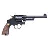 REVOLVER. Cal. 455 Webley. S# 1509. Bbl. 6 1/2". Round blade front sight. Fixed rear sight. Matching numbers on frame, cyl., bbl. & extractor. Early British issue Triple Lock revolver. Right front of frame has British "X" marking & rear of frame has two Broad Arrows facing each other. Other parts have varied British inspection stamps. Blued finish with case colored trigger & hammer. Unnumbered checkered hardwood grips with diamond center & gold S&W medallions. Lanyard ring present on bottom of grip frame. UNATTACHED ACCESSORIES: aftermarket black hardcase with leather holster. CONDITION: grips show some staining, handling marks & dings. Trigger & hammer retain strong amounts of case colors with some fading & light oxidation. Balance of metal retains 70% blue with some pitting underneath grips, scattered dings, light oxidation, edge wear & fading. Bottom of grip frame has scratch initials that appear to read "GR". Action functions properly when hand cycled. Very good bright bore with some light oxidation. (24-6898/MJC). CURIO. $1200-1800.