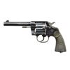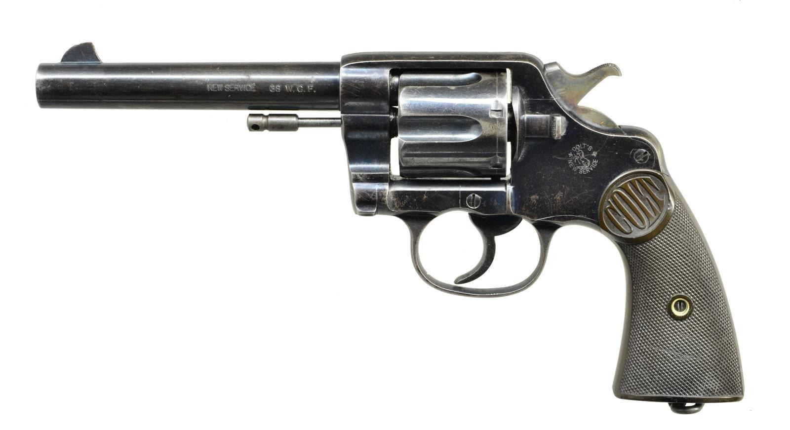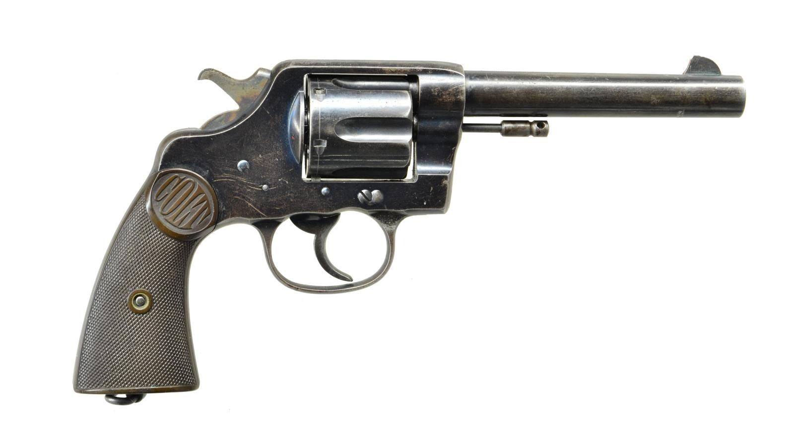 REVOLVER. Cal. 38 WCF (38-40). S# 5948 (1901). Bbl. 5 1/2" w/ blade front sight & June 5, 1900 last patent date. Blue finished w/ 6 shot fluted swing out cyl. Fire blued trigger. 2 Piece "COLT" hard rubber grips w/ hand scratched matching number on backs along w/ another indiscernible mark on back of right panel. CONDITION: Good metal finish w/ wear, oxidation, cyl. turn line, handling marks & pitting. Very good grips. Very good bore w/ frosting. (22-2005/MD). CURIO. $800-1,200.