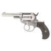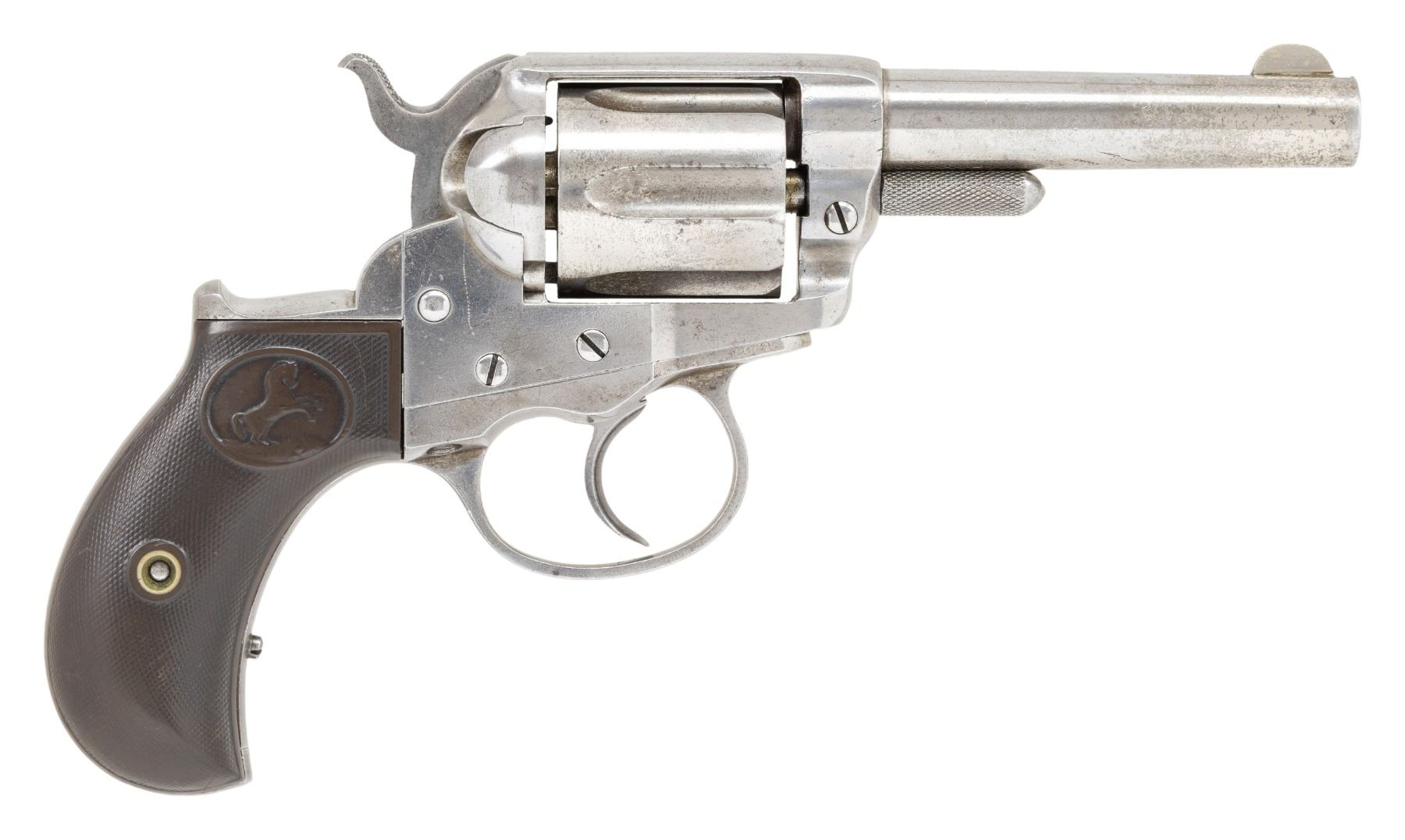 DOUBLE ACTION REVOLVER WITH FACTORY LETTER. Cal. 38 Colt. S# 5244. Bbl. 3 1/2". Model 1877 "Lightning" double action revolver mfg. by Colt in 1878. Let side of the bbl. exhibits a faint "COLT D.A. 38" etched panel, with Colt's 2-line address stamped across the top. Left side of the frame is marked with Colt's 3-line patent information, with "38 CAL" marked on the left side of the rear trigger guard web. Metal components exhibit a nickel plated finish. Frame is mounted with 2-piece Colt checkered brown hard rubber grips. Interior of right panel is inscribed with an "R". Half-moon blade front sight and frame notched rear sight. Frame, trigger guard, and rear grip strap are matching via "5244" with the cyl. matching via "244". UNATTACHED ACCESSORIES: Colt factory letter dated December 16, 1970 stating: "Caliber 38/ Barrel length 3 1/2"/ Type of stocks Rubber/ Sold and shipped to Spies Kissam & Co./ Address New York, N.Y./ Date of shipment March 21, 1878/ Number of same type guns in shipment 2". CONDITION: metal components retain traces of their original nickel plated finish, with the balance having faded to a gray patina, showing some spots/areas of light pitting and age related discoloration. Relatively bright bore, exhibiting scattered spots and patches of mild pitting and consistent mild pitting at/around the muzzle, while retaining strong rifling throughout. Action does not function, with the cyl. not rotating when hammer is cocked. Hammer and trigger lock up when the trigger is in the forward position. Grips show smoothing and scattered superficial handling marks, but otherwise remain sound. PROVENANCE: The Esteemed Norm Greenberg Collection. (01-27684/MLW). ANTIQUE. $400-600.