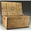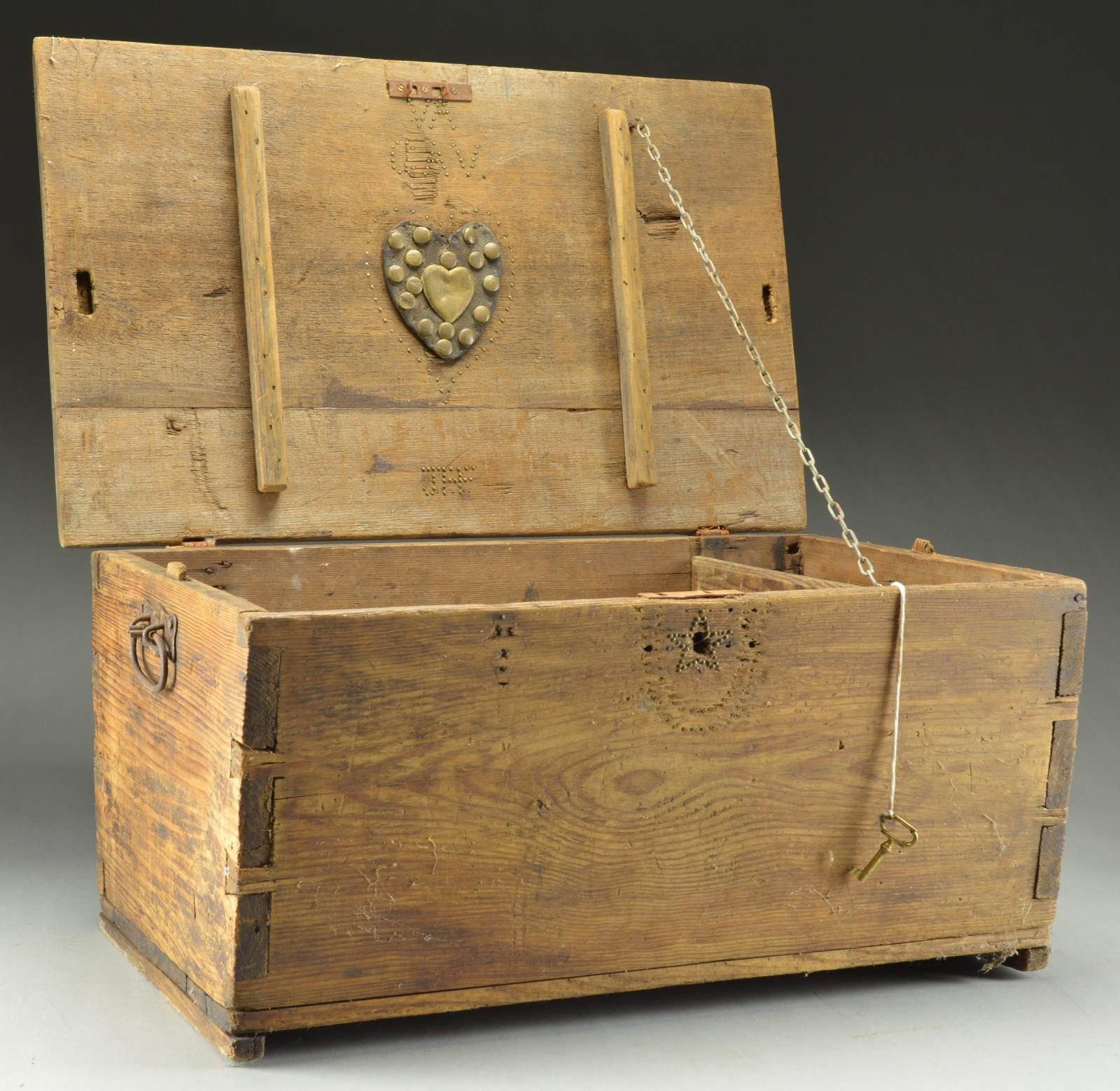 VIRGINIA FARRIER. Box measures approximately 24” x 14” x 11 1/2" high. Box appears to be made of yellow pine with a poplar lid. There are iron handles on opposite ends and iron hinges in the rear. The keyhole is decorated with brass nails in the shape of a star. The interior of the lid has similar brass nail decoration that reads “VA CAV. (heart) JFF”. There is a leather & brass martingale in the center of the heart. The interior of the box has a till on the right hand side & a leather looped strap in the rear to hold tools. A chain is attached to hold the lid while open. Though it is impossible to accurately date the period of the brass nail decoration, the box itself shows construction techniques utilized in the 1840’s through the 1870’s. CONDITION: box shows moderate to heavy wear but remains relatively solid throughout. Brass nails are well patinated and iron parts are oxidized. (02-17471/BF). $400-600.