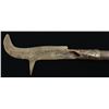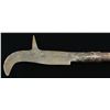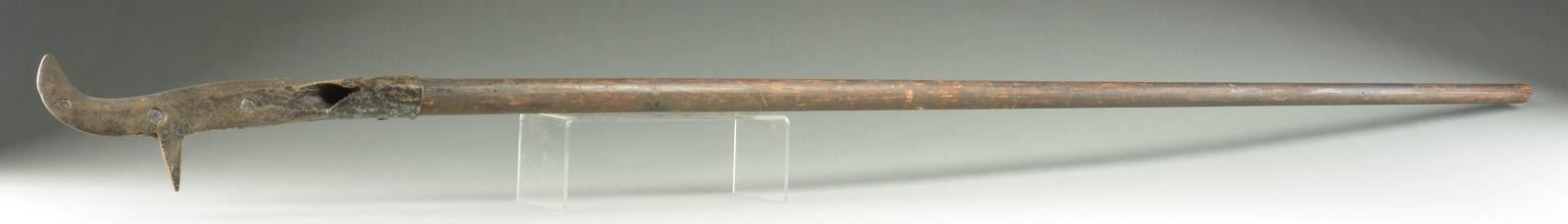 Billhook measures approx. 82" overall with a 15" forged iron head. The head has a recurved fascine knife blade with a 2 1/2" spike at the opposite side. The hand forged socket is quite crude and is connected to the haft with 2 wrought nails. The blade itself has 3 armorers marks that appear to be several dots with the letter “M” inside a heart. The wooden haft is a modern replacement for display purposes. CONDITION: the head shows great age with a cleaned medium gray patina throughout. There are areas of cleaned oxidation on every surface. The haft shows handling wear. (02-18084/BF). $300-500.