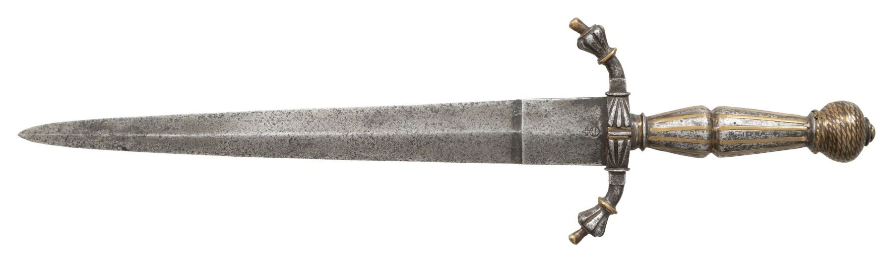 This dagger measures 14 1/4" overall with a plain 10" blade that has a raised medial ridge and is marked with cross & orb on both sides. The hilt is iron and brass with a down turned crossguard showing swelled quillons. The grip and pommel are again iron and brass melded together in an artistic and appealing way. The pommel appears to be wire wrapped but in actuality, the brass is inlaid into the iron to simulate wire. Truly exceptional workmanship. No sheath. CONDITION: the blade has an overall dark gray peppery patina. The brass in the hilt shows a mellow dark mustard patina and the iron is similar to the blade. PROVENANCE: Estate Collection of Nicholas Apergis.(02-24793/BF). $500-800.