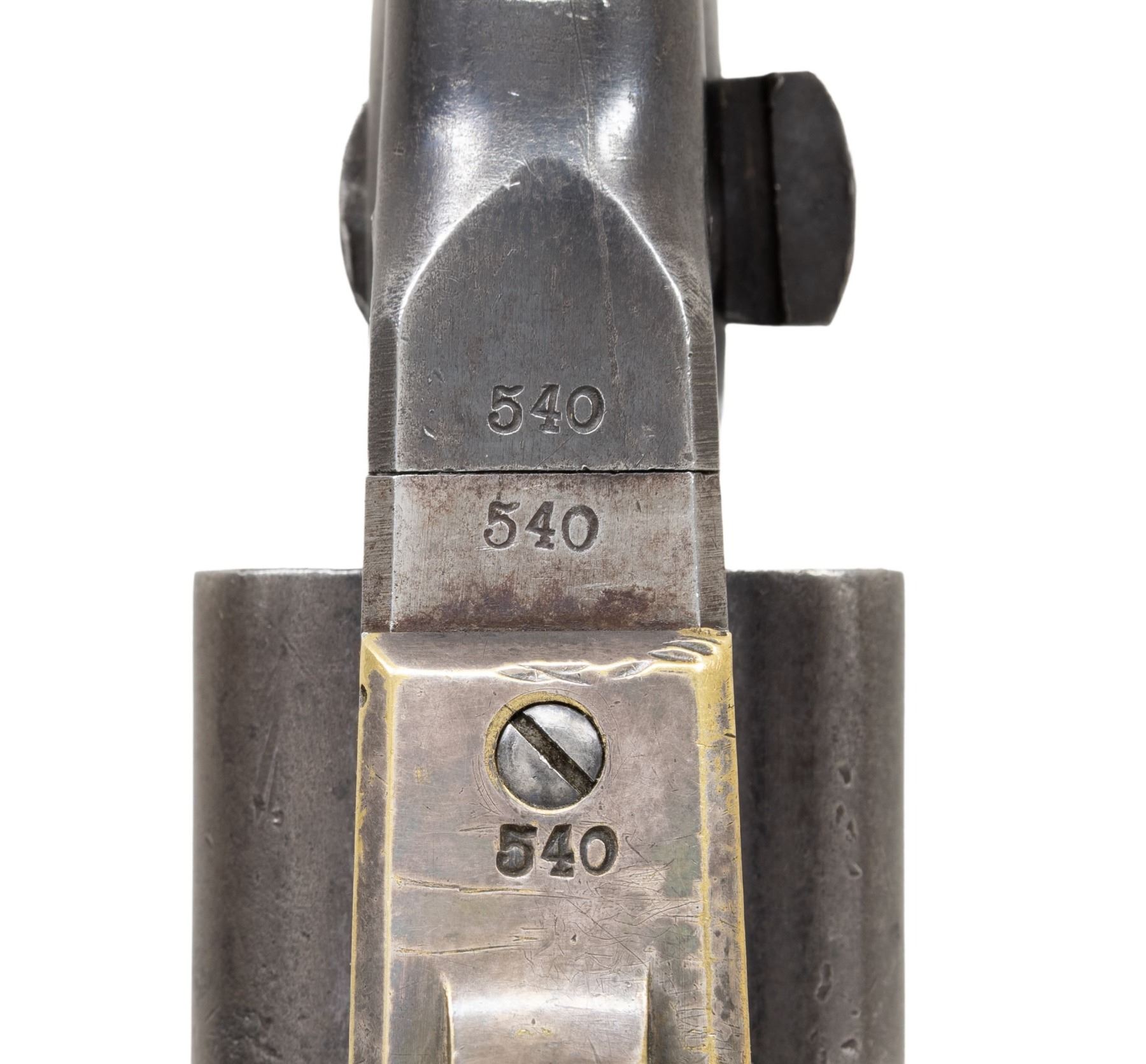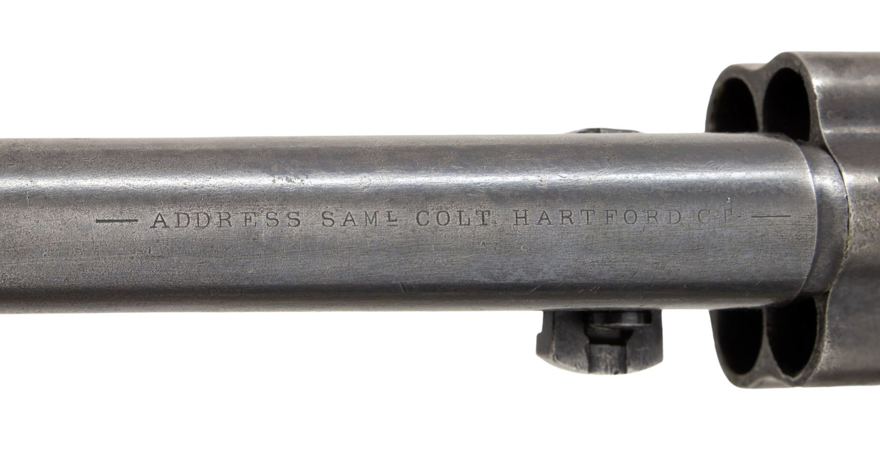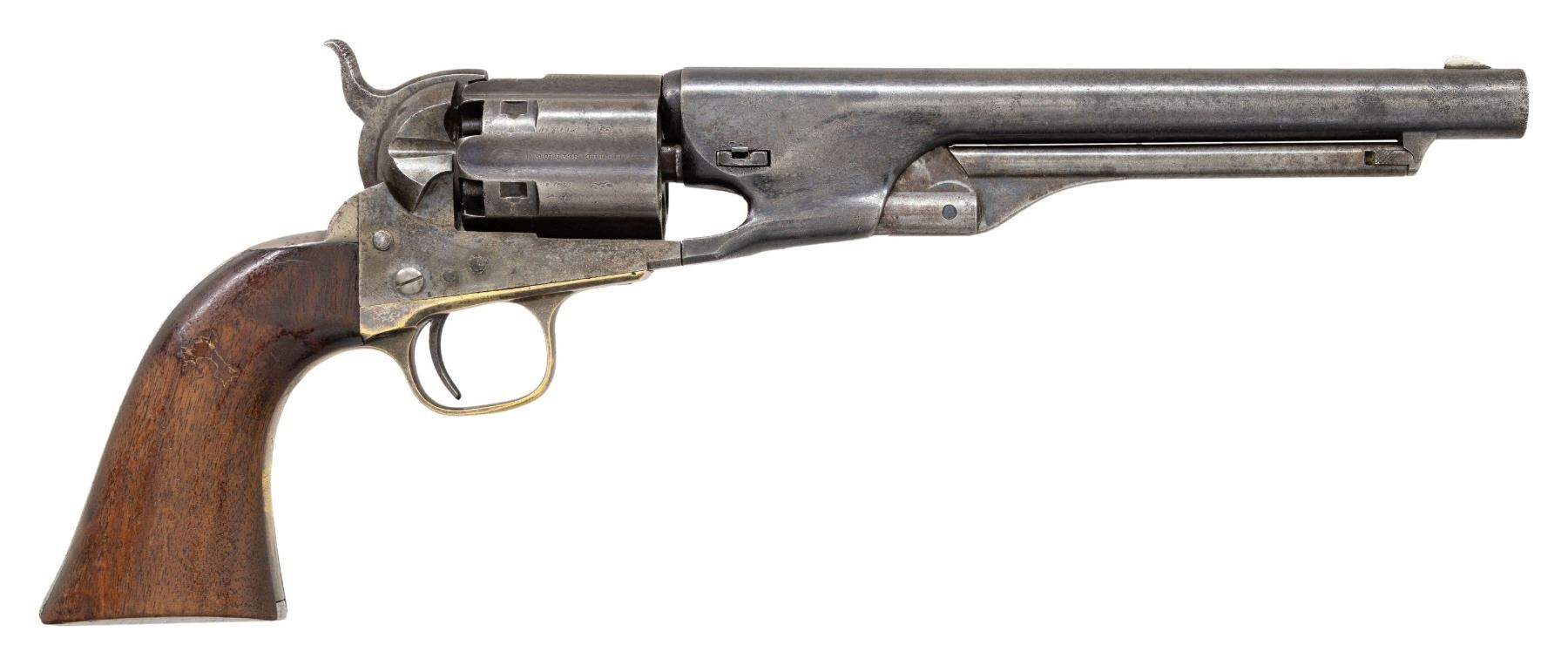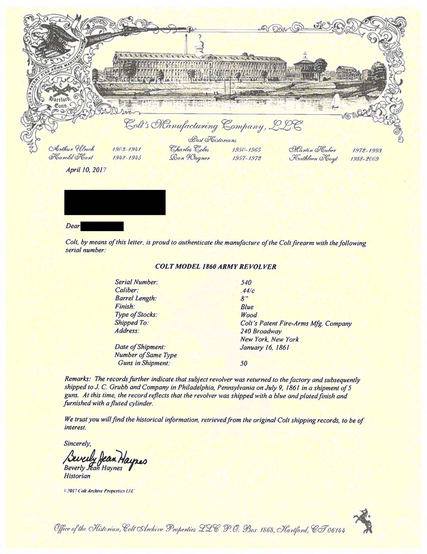 Cal. 44. S# 540. Standard configuration revolver, 8" barrel, German silver blade front sight, 1-line Hartford address, 6-shot fluted cylinder with S# in one flute and "PATENTED SEPT 10th 1860", 4-screw frame with raised screws to accept stock. Frame stamped "COLT'S PATENT" on left side, silver plated brass trigger guard & iron back strap, varnished walnut grips. Revolver shipped to NY Agency January 1861 and in range of revolvers shipped to Georgia, South Carolina, & Maryland just before Civil War began, gun was returned to factory and shipped to JC Grubb of Philadelphia where several identified guns shipped there have Confederate IDs. Displayed in vintage COLT plaqued oak casing. This is a superior 3-digit fluted Colt that saw use, but survived in beautiful condition. UNATTACHED ACCESSORIES: Colt factory letter. CONDITION: revolver is fine, all matching, original, and complete. Barrel retains about 20% blue finish & cylinder has strong traces of blue in flutes. Traces of case color on frame & loading arm, grips sound and well fit with traces of old added varnish, grip frame retains about 20% silver plate, steel back strap cleaned with pitting. Mechanics are fine, crisp shiny bore. Accompanying display case is very good with reproduction decorative accessories. PROVENANCE: Estate Collection of John "Jack" Dhooghe. (01-28226/JS). ANTIQUE. $7,000-9,000.