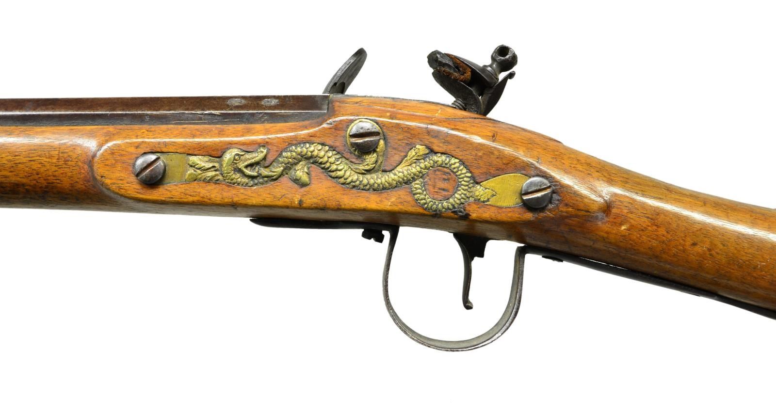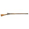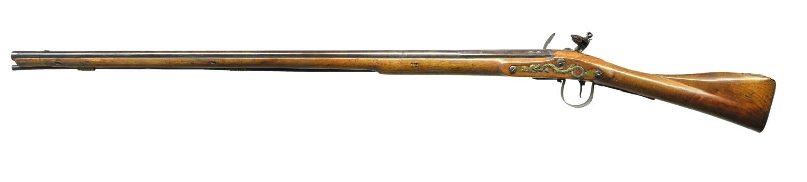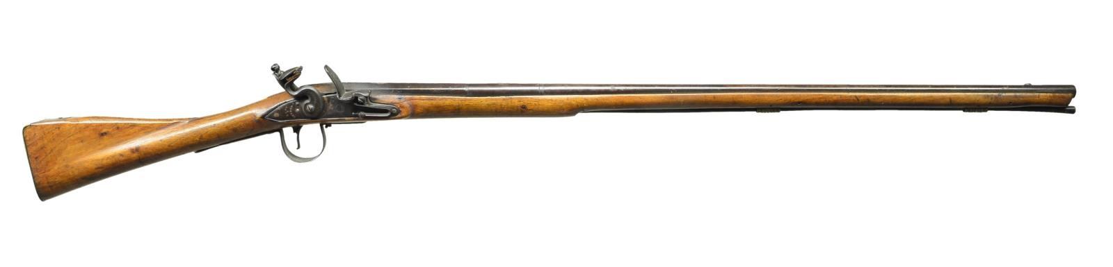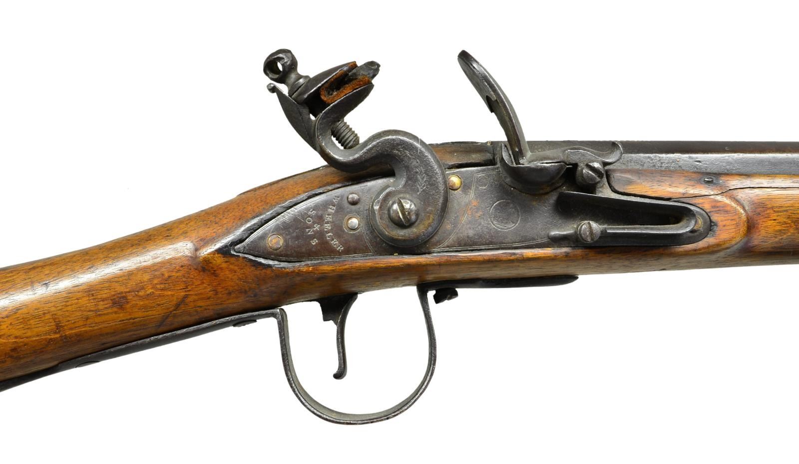WHEELER & SONS. Cal. 60. NSN. Robert Wheeler had a contract with the British board of ordnance and delivered 1,491 Indian trade guns to the British to be distributed during the War of 1812. This gun has 36 1/2" octagon to round barrel with Birmingham proofs at breech end. Top flat is stamped with fox head within a circle and "LONDON". A crowned "14" is at rear of barrel tang. Lock with rounded plate having slight arch is fitted with serpentine cock, inset rounded pan, unbridled frizzen and feather spring with dog nose finial. Fox head in circle is at center and tail is marked "WHEELER" "&" "SONS". Trigger is of medium size and trigger guard has deeply curved bow. Walnut stock with handrail comb has well shaped beavertail molding around barrel tang. Brass buttplate is nailed to stock and a classic coiled sea monster brass sideplate is affixed with three large screws. Stock extends to muzzle and is pinned to barrel. A steel ramrod is held by two multi ring brass pipes and hole as thimble. CONDITION: good. Barrel and lock retaining smooth dark brown patina with some vice marks on barrel. Stock with old oil finish has had comb drastically lowered but is otherwise fine. The is a tack repair at top front of lock. Bore is lightly pitted. Lock is very stiff but appears to be operable. Frizzen has been resteeled and bottom portion of steel broken out. A historically important gun. PROVENANCE: From the Lifelong Collection of Glen E. Mattox. (01-22564/MGM). ANTIQUE. $3,000-5,000.