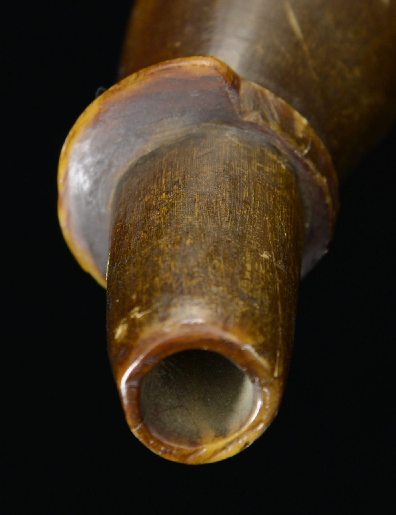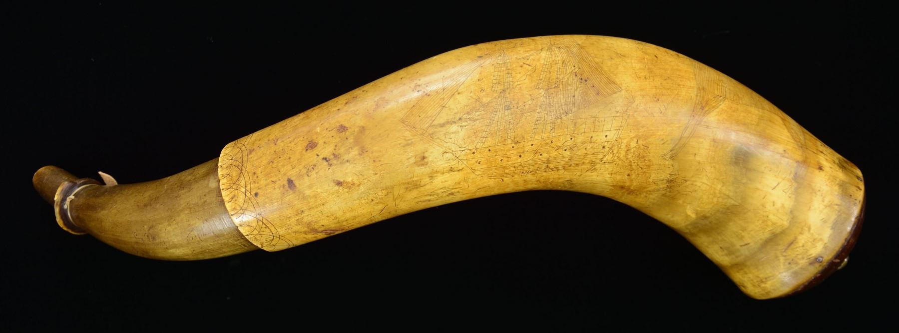 POSSIBLE SOUTHERN ORIGIN. This horn measures approx. 15 1/4" in length and approx. 3" across the butt. The first 5 1/2" from the spout is turned smooth. The remaining 9 3/4" shows several engraved motifs by a fairly skilled folky hand. Engravings include a woman holding a flower, a farmhouse with fence surrounded by trees, a large horse, and a sailing vessel of Brig form but with two gun decks showing 15 gun ports on one side. The butt boasts its original convex turned wood plug with a central brass pierced knob and escutcheon plate to accept a carrying strap. CONDITION: horn has a very pleasing early patina with just a few tiny scattered worm holes. The spout has a raised ring that is 60% intact. The plug in the butt remains tight and retains original finish. A fine early horn originally purchased by a collector from a southern estate. (02-23207/BF). $1,300-1,800.