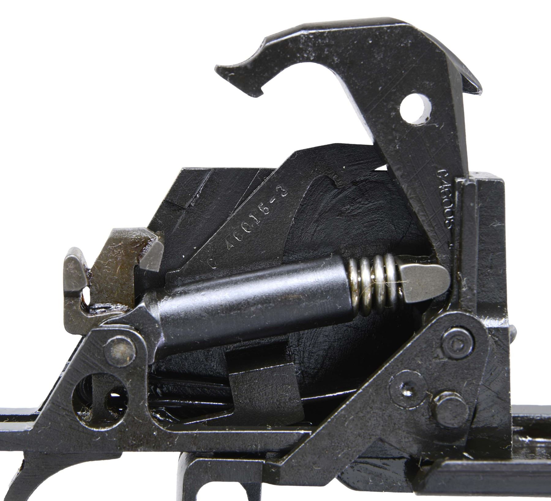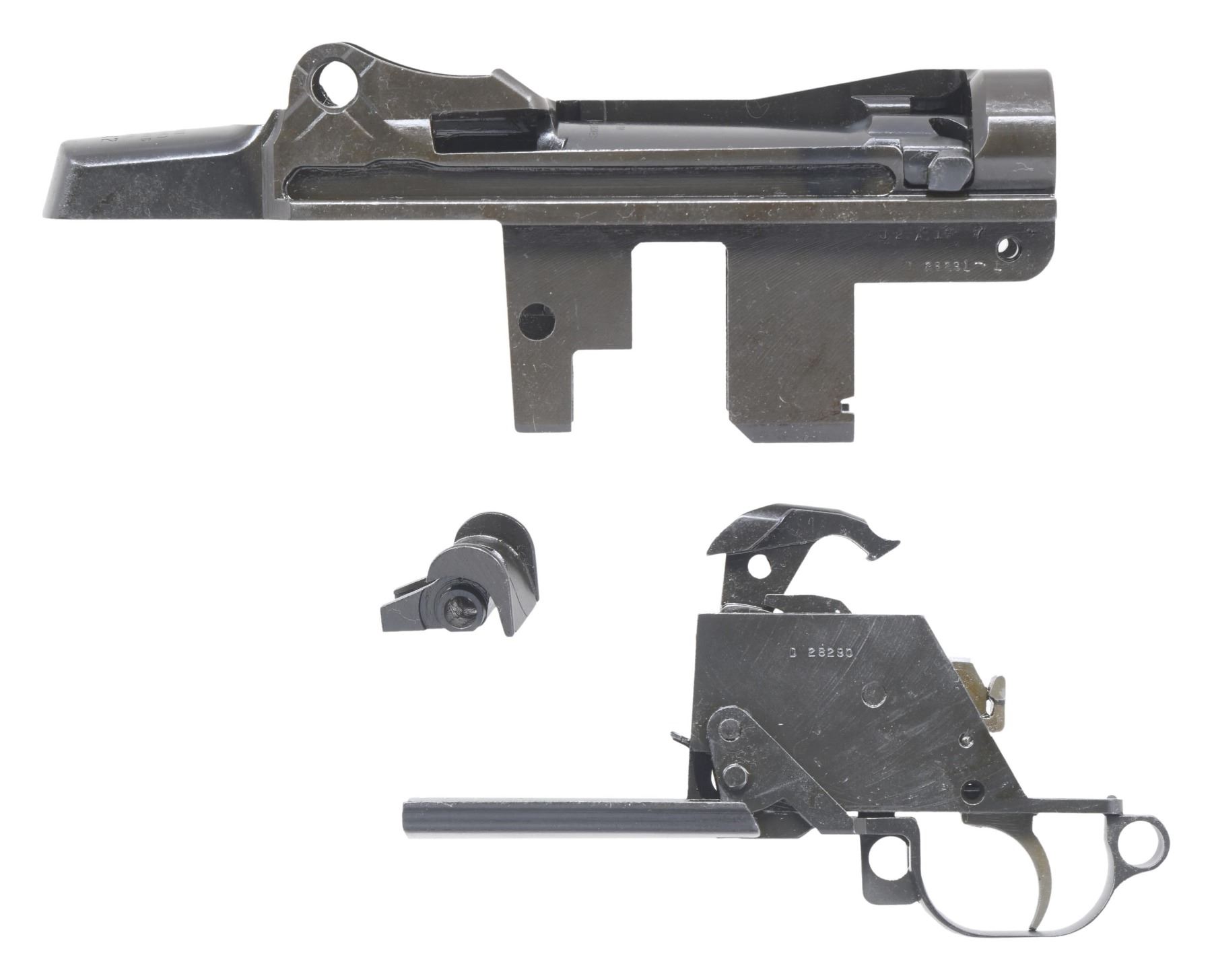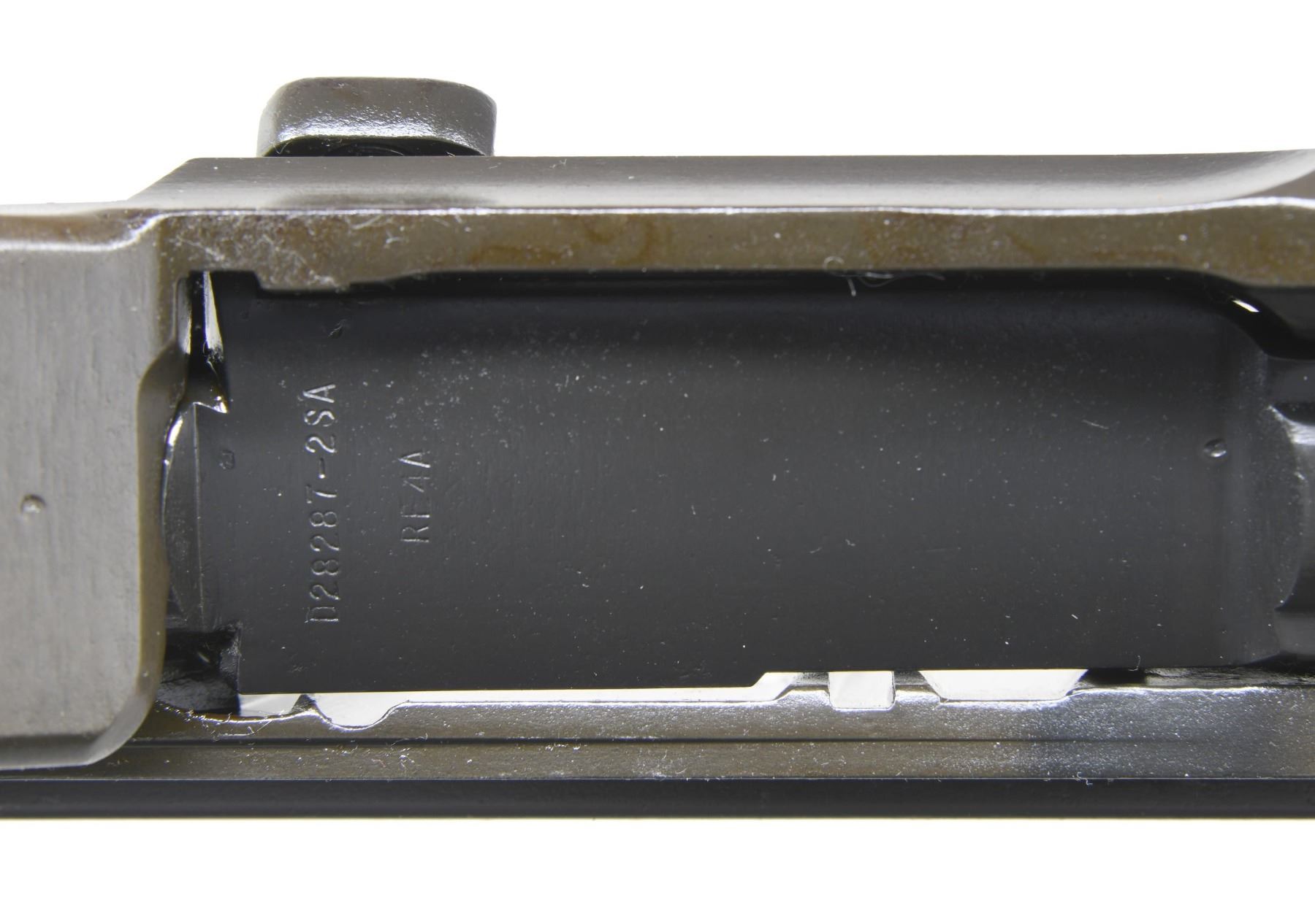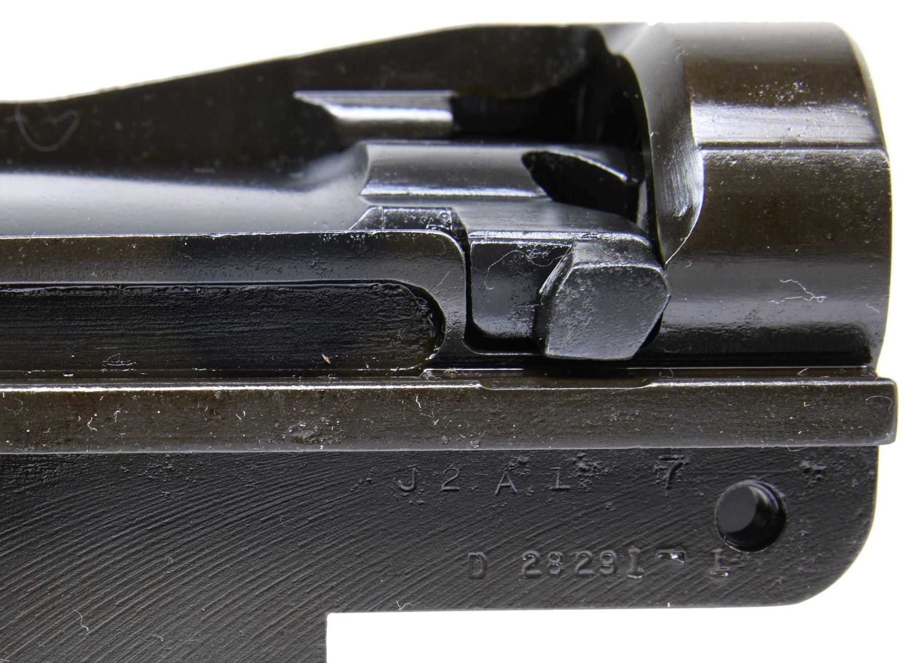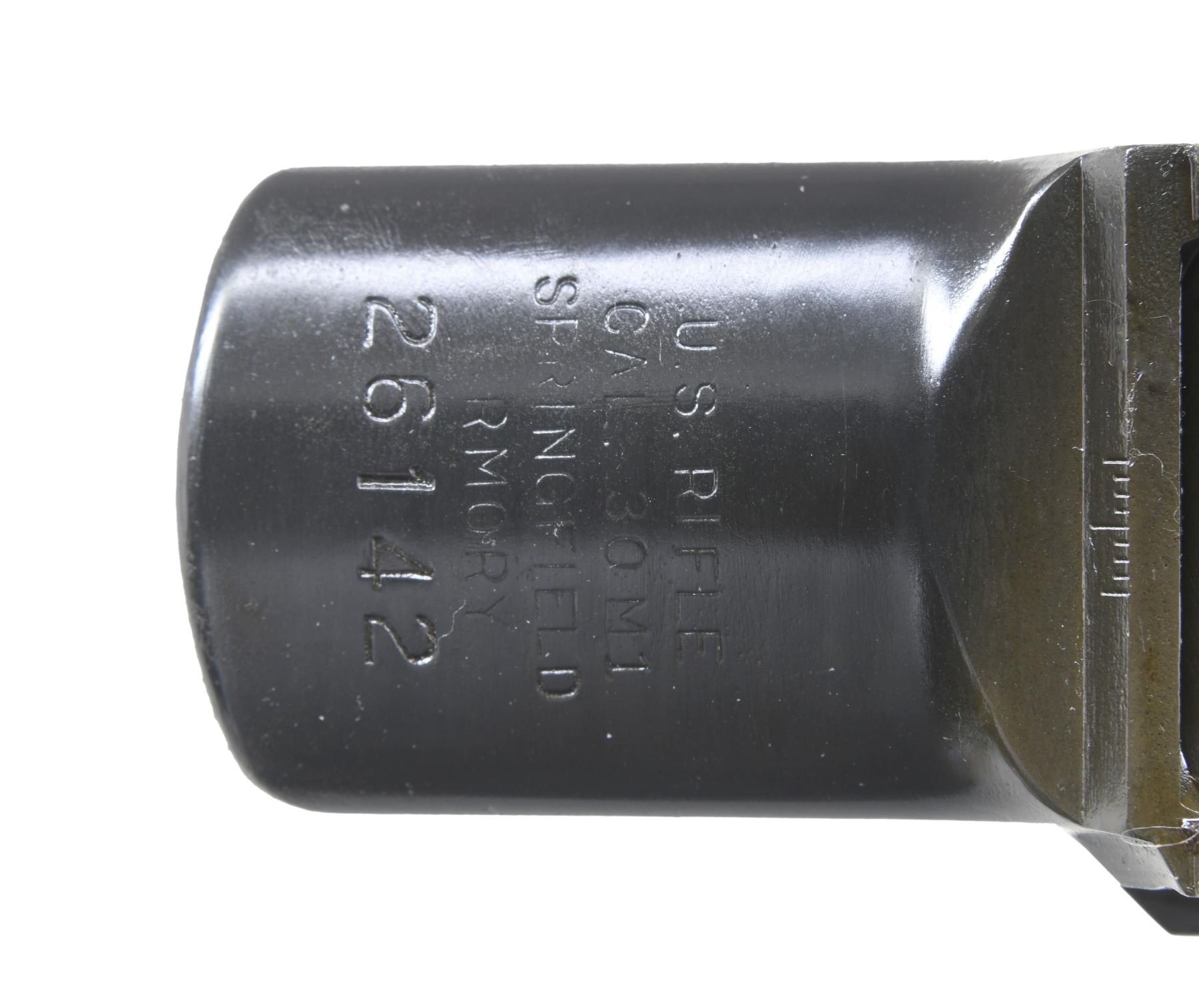 S# 26142. Receiver marked at heel "U.S. RIFLE / CAL. .30M1 / SPRINGFIELD / ARMORY / 26142". Receiver is additionally marked on the right forward end w/ the "D 28291-1" drawing number & marked above w/ "J 2 A 1 7" heat lot numbers. Receiver has distinctly repaired vertical rib to cure the infamous seventh rd. stoppage. Clip latch assembly is installed. Clip latch has the early rounded front. Stripped bolt is included. Bolt is from the 1940s period & marked w/ "D28287" drawing number which includes the "-2SA" heat code marking is "RE4A". Bolt contains no additional parts. Trigger housing assembly is marked on left side only w/ "D28290". Additional drawing numbers appear on the trigger guard hammer & safety. No "SA" is present. Rear sight base has no drawing number & is made w/o the early "0" at the rear. CONDITION: all metal parts have been subjected to a dark arsenal rework Parkerized type finish over moderate wear & scattered spots of fine pitting. Pitting is most notable on receiver, under wood line & at the face of receiver ring. (25-3018/RW). MODERN. $400-600