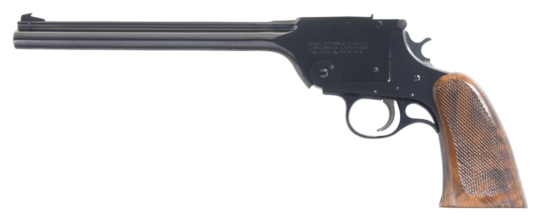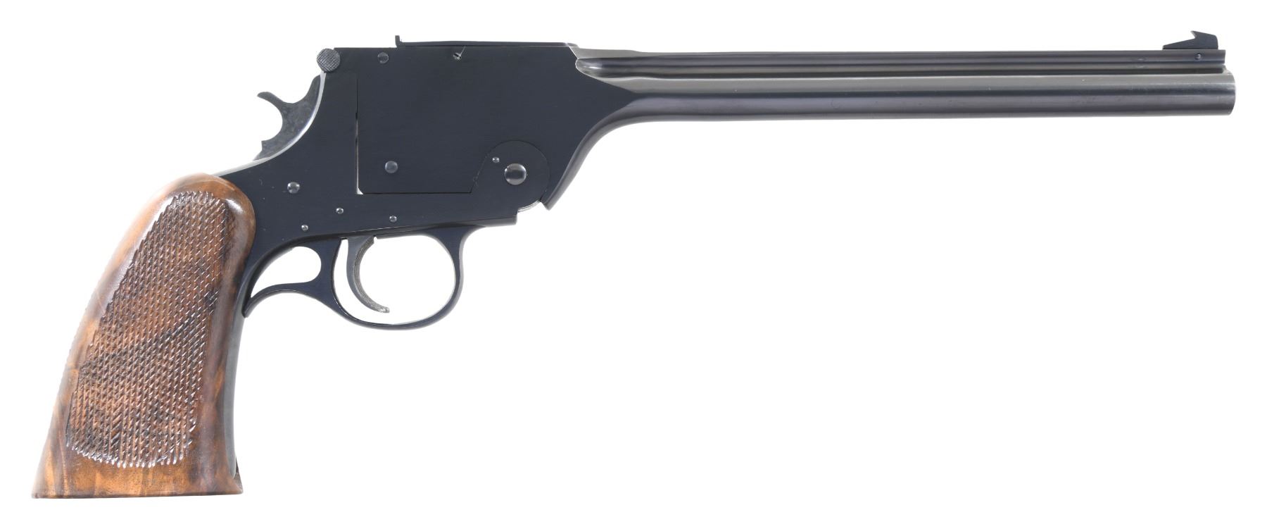 SINGLE SHOT TARGET PISTOL. Cal. 22 LR. S# 1087. Bbl. 10". fluted with hooked Patridge front sight and early square notch rear. Mfg. 1928-1941, total production is estimated to be only a few thousand. These pistols were mfg. as competition for Colt's vaunted Camp Perry pistol with Walter Roper overseeing development. This pistol features the early curverd serrated trigger, low checkered hammer, and knurled circlular bbl. latch. Checkered wraparound grips. CONDITION: very fine overall retaining 97% original blue with only a few scattered light handling marks present. Near excellent grips. Mint bore. (25-1619/BH). MODERN. $800-1,200.