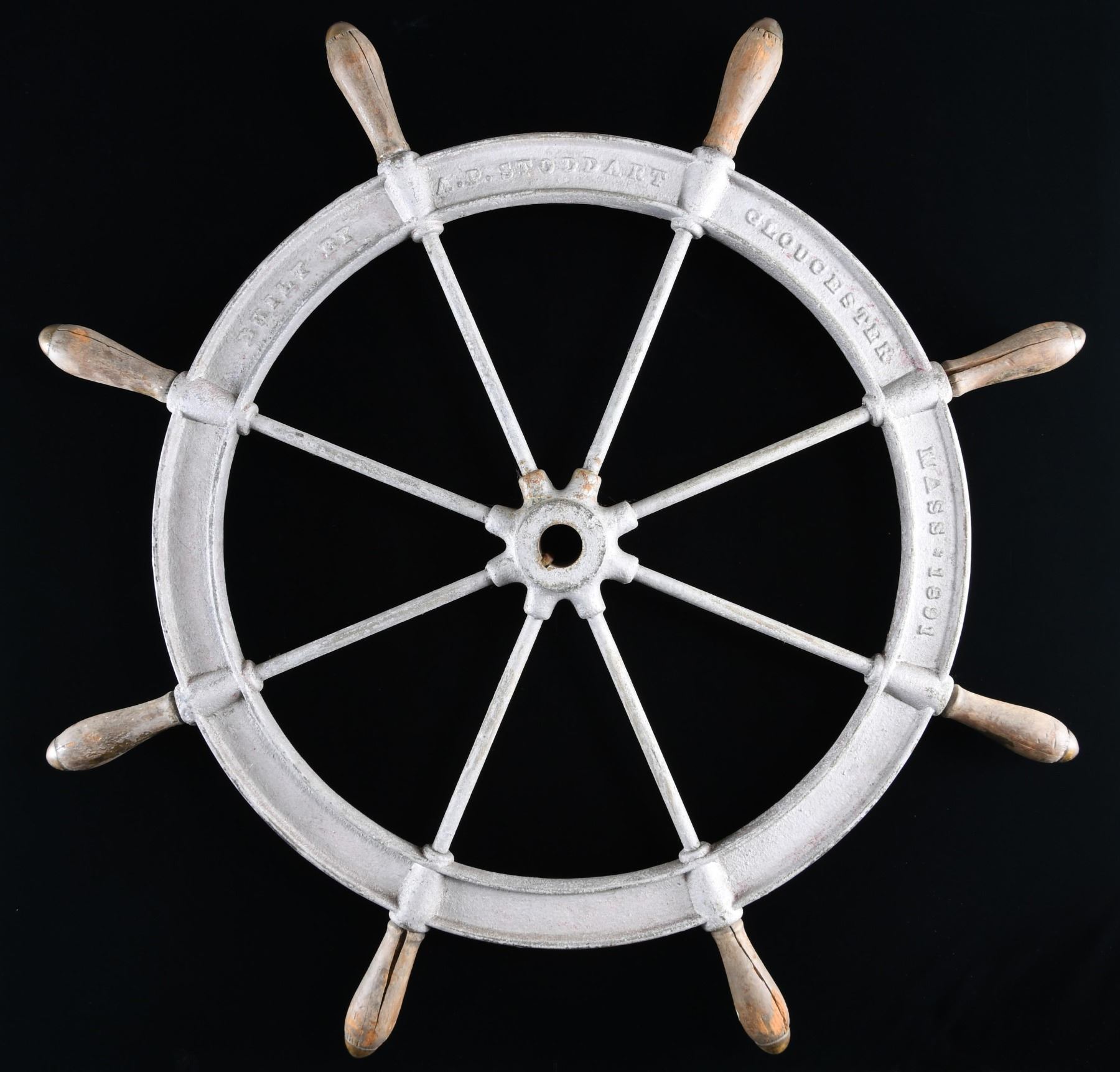 GLOUCESTER, MA. This exceptionally heavy ship's wheel measures approximately 43 1/2" in diameter and is primarily made of cast iron. On one side the wheel is embossed "BUILT BY A.P. STODDART GLOUCESTER MASS 1891". The wheel has 8 spokes, terminated by wooden handles, measuring nearly 6" in length. The wheel has a silver painted finish and the handles are natural. CONDITION: painted finish is about 70%. There is no damage to the wheel other than expected oxidation. Most of the wooden handles exhibit drying cracks but are complete. (02-23814 /BF). $200-400.