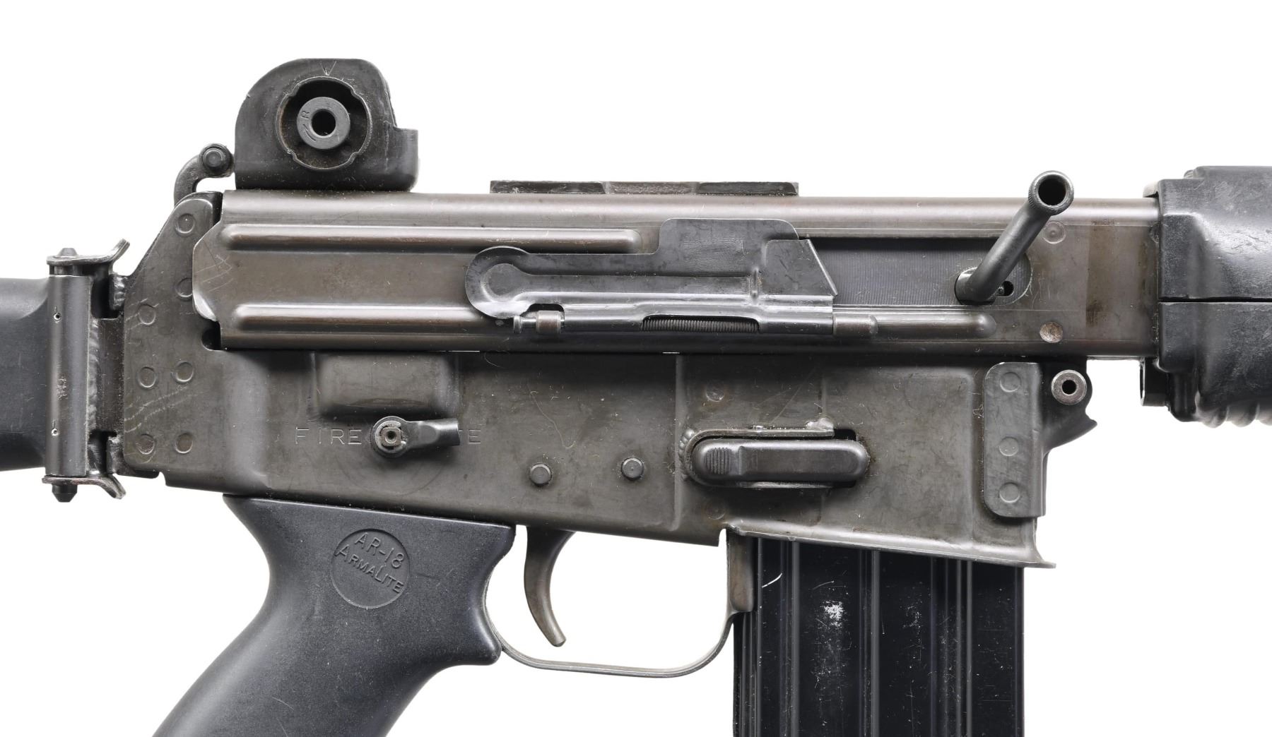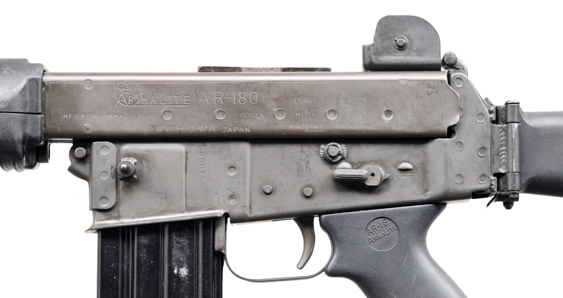 Cal. 5.56mm. S# S10590. Bbl. length 18". The original ArmaLite AR-18 was designed in 1963 in CA. as a potential alternative for the U.S. military. When it started to look as though it would not be adopted as a standard service rifle, production was licensed to Howa Machinery Co. in Japan where they began production in 1967. Because military sales to U.S. were effected by American-Japanese treaty agreements that forbid Japan in selling to arms to "belligerent nations", it was determined rifles could not be sold to the U.S. due to our involvement in Vietnam. In 1974 ArmaLite & Sterling Ltd. in England signed a production agreement to manufacture both the AR-18 (Select-Fire version) & the AR-180 (the semi automatic commercial version) & started manufacturing rifles in 1975. This particular example was mfg. for ArmaLite Inc. in Costa Mesa, CA. by Howa Japan under ArmaLite patents. Serial number located on lower receiver. It is a gas operated piston driven semi auto rifle w/ a left side folding stock. Front sight is an elevation adjustable protected post. Rear sight is a windage adjustable dual aperture peep sight marked 200 & 400.The rifle is charged by a reciprocating handle on the right side of the rifle. Ambidextrous safety selector controls. Black plastic furniture. Proper muzzle brake & correct partial bayonet lug w/ sling swivel. MAGS: 1 aluminum 20 rd. w/ ArmaLite AR-18 floorplate. CONDITION: bluing is complete on all exposed metal surfaces w/ some gentle thinning in areas of moving parts. Stock locks tightly in open & closed positions. Bore is bright w/ strong rifling. Fire control mechanism appears to function correctly when cycled by hand. PROVENANCE: Lifelong Collection of Terrence McCarty. (24-320/JZ). MODERN. $1,200-1,800.