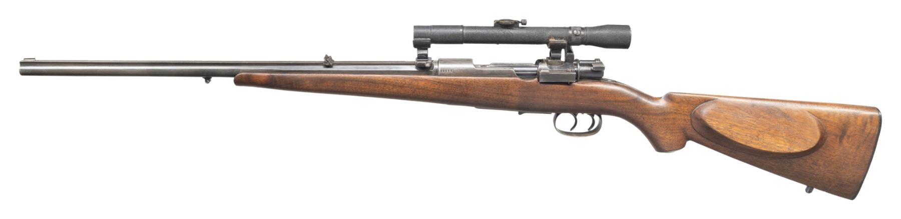Cal. 8x57. S# 76838. Bbl. 21 1/2" part-oct part-rnd. Bead front sight. Flip up rear sight. Claw mounted unmarked German scope that has old black enamel refinish. Scope has post reticle & green tinted optics. Early small ring Mauser with cock-on-close bolt that lacks gas holes but has a 98 style shroud. Double set triggers. Bbl. top has JP Sauer marking. Right rear of bbl. has Prussian eagle stamp. Rear of bbl. has "GUSS-STAHL KRUPP ESSEN" marking. Left of bbl. has "2,75 GGBP/Stmg" proof. Many parts including bolt bear "27" assembly number. Bolt handle also has crown "N" proof. Floorplate & right rear of receiver have levers. Metal has old reblue. Pistol grip walnut stock that appears to be period replaced with matching stencil number in bbl. channel, crude bedding, left side cheekpiece that appears added & bottom sling studs. CONDITION: stock has an old refinish appearance with 1 1/2" crack behind upper tang, some dings & handling marks. Metal has a light gray appearance with some screws showing slot damage, traces of reblue, scattered edge wear, handling marks & light oxidation. Action functions properly when hand cycled. Worn bore with scattered oxidation. PROVENANCE: From the Buckstix Collection. (25-6398/MJC). CURIO. $1,750-2,500.