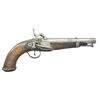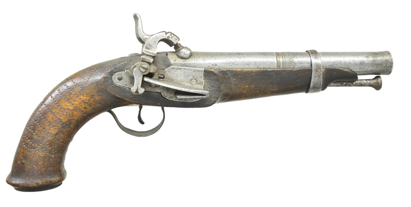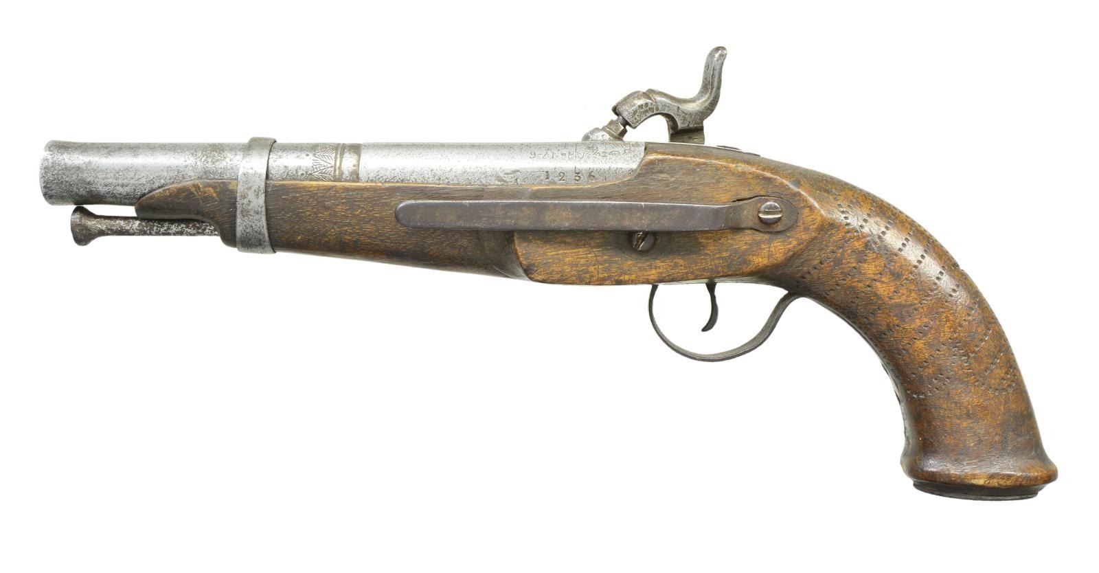 Cal. 70. S# 1236 (1822). Bbl. 7 7/8" smoothbore w/ swamped muzzle & engraved faceted transition. Breech section of bbl. has extensive cartouches including S# 1236 & "C de 17-6" appearing to indicate 17th Cavalry, 6th Trooper. Top tang marked "1822 C'. Hardwood stock w/ punch dot grip, iron button tipped ramrod, left side belt hook, bbl. band & buttcap. CONDITION: metal has gray patina appearance w/ heavy pitting around nipple, at muzzle & on top of ramrod. Worn stock has notable gouge at wrist along w/ sm. gouges, marks & scratches. Belt hook shows loose play. Dark pitted bore. (01-23042/MD) . ANTIQUE. $700-1,000.
