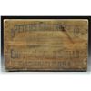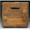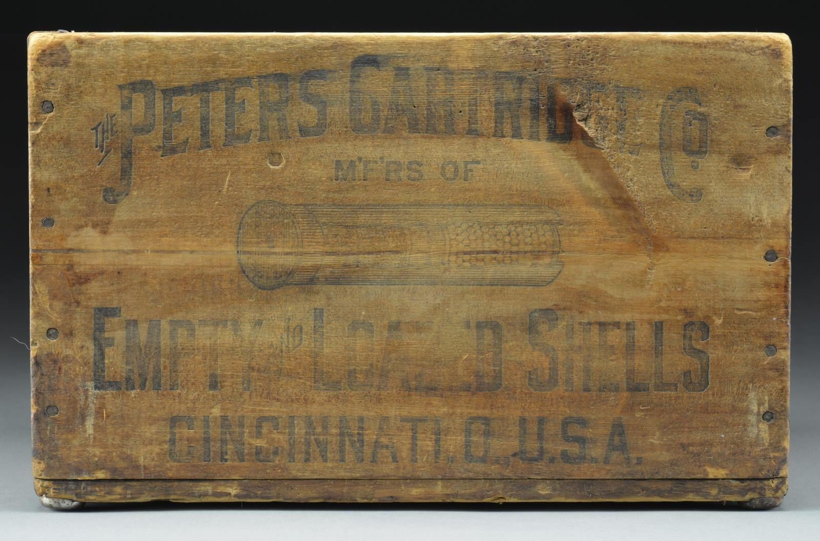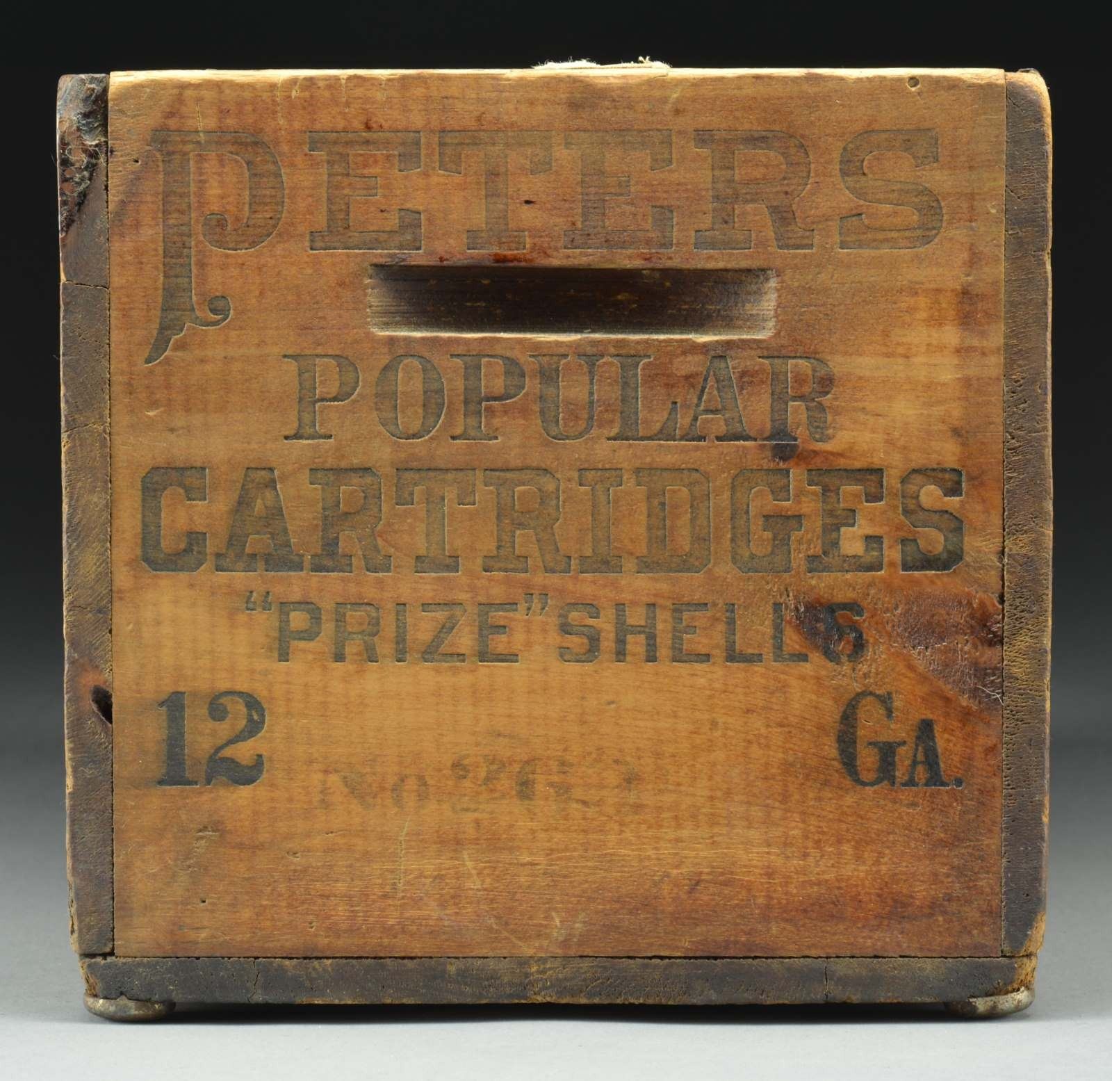 SHELL CRATE. 15" X 10" X 10" Wooden ammo box for Peters Popular Cartridges “PRIZE” Shells 12 Ga. Sides display for Empty & loaded shells in Cincinatti, Ohio. Nail fastened box w/ metal rnd. Feet on bottom. CONDITION: good overall w/ moderate handling marks, lg. grain checks & oxidation. 1" x 10" sliver of side of box is missing. (02-16599-2/MD). $200-400.