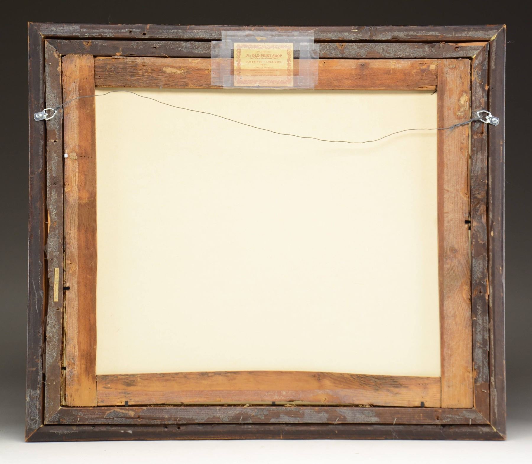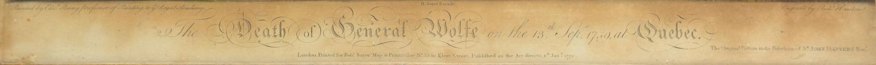 EDWARD PENNY RA. This fine and scarce early print is housed in a 21 1/2" x 24 1/2" frame of the 19th century, with the sight size of the print being 17" x 20". The print was part of the "British School II" album that originally contained 170 prints and was published in the 18th century. The full title of the print is "The Death of General Wolfe on the 13th Sept. 1759, at Quebec." The print depicts Wolfe being attended by Grenadiers after falling mortally wounded on the battlefield. The original painting was done by Edward Penny of the Royal Academy, and the engraving was completed by Richard Houston. It was printed by Robert Sayer of Fleet Street on the 1st of January, 1772. The print has been hand-colored with the blues and reds remaining surprisingly vibrant. CONDITION: the print is a bit dark, showing notable foxing and discoloration. There are two lineal abrasions in the upper left field that do not detract from the images of this historic early print. The frame shows wear but has its original early irregular glass intact. (02-23199/BF). $800-1,200.