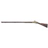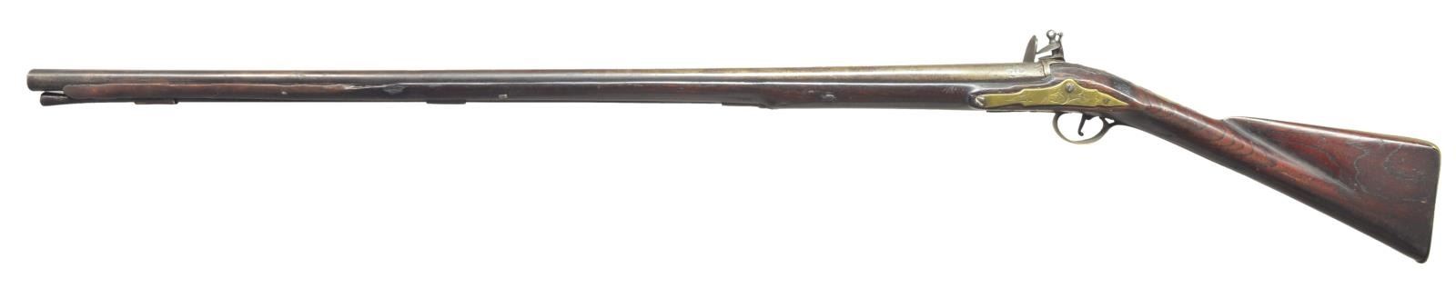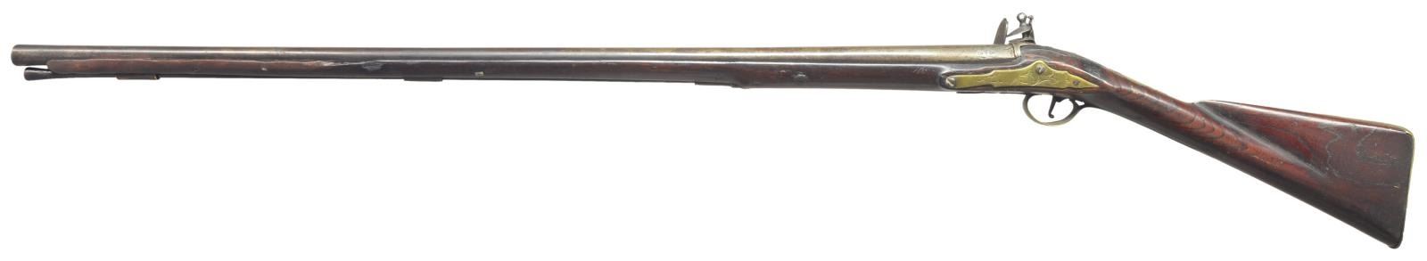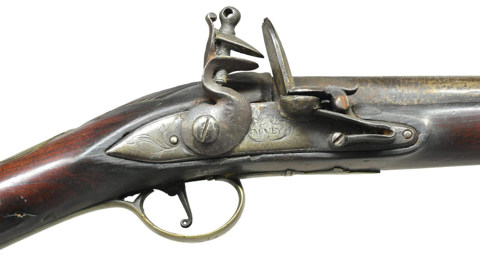 Cal. 70. NSN. Bbl. 38 1/4", deeply swamped rnd. bbl. engraved "MCVEY? GLASGOW" on top. Lock in original flint w/ scroll engraving on rounded lockplate & is also engraved "McVEY" under pan. Lock features serpentine cock, unbridled frizzen & simple feather spring w/ no finial. Hand rail style stock appears to be made of elm & brass mounted. Stock mounts to bbl. w/ 3 sliding side bolts. Bbl. lifts out of breech iron. Brass furniture consist of trigger guard w/ early husk finial, buttplate w/ steeple top finial & nicely shaped sideplate. Sideplate & buttplate tang engraved w/ scroll matching that on lock. Brass crest plate is at top of grip. There is raised carving around bbl. tang. Iron ramrod mounts through 2 plain pipes & shaped thimble. CONDITION: bbl. & lock exhibit smooth brown patina w/ considerable pitting at breech area. Pan area has been patched w/ plastic steel to improve seal against bbl. Stock retains old finish w/ numerous marks & scratches w/ hand worn patina at grip & forepiece. There are epoxy repairs in last 12" bbl. channel towards muzzle. Lock is operable. Pitted bore. Bore is obstructed by apparent old patch or cleaning material. PROVENANCE: The Estate Collection of Gary Parietti. (01-19743/MGM). ANTIQUE. $500-800.