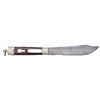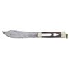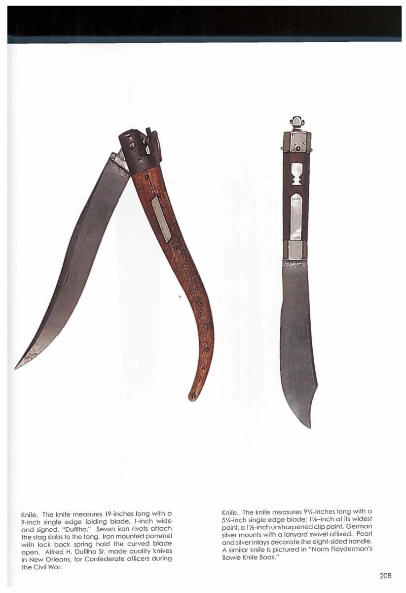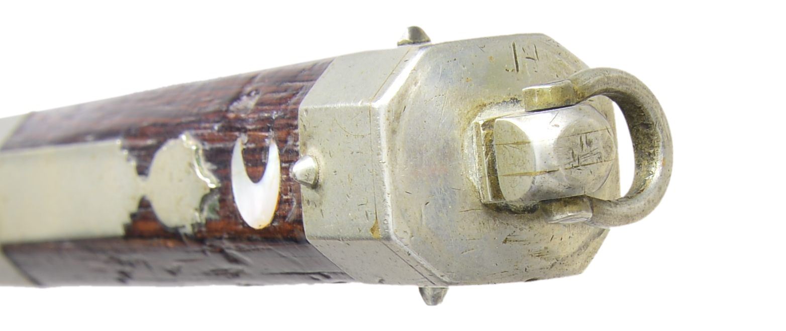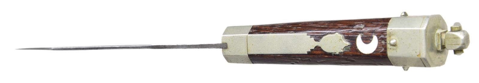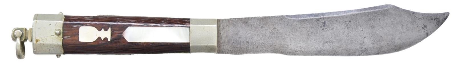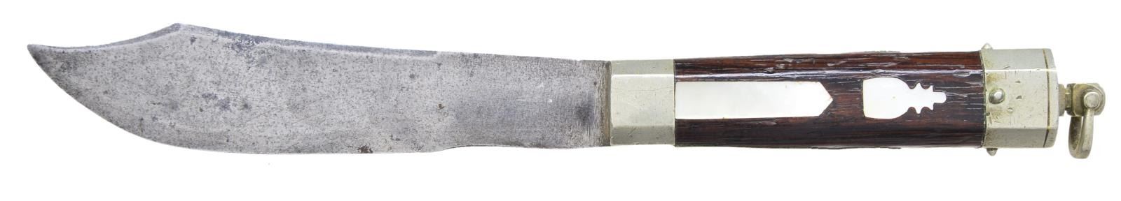 INSET GRIP WITH LANYARD SWIVEL. 9.75” overall, 5.25” clip point tapered larger toward point. German silver mounted dark wood grip inset with mother of pearl heart, crescent moon, wine glass, and pineapple. Norm Flayderman shows nearly identical knife by same maker on page 33 of “The Bowie Knife”. These unique knives appear are so well made and based on Flayderman knife being naval, these are probably made in port, New Orleans, or San Francisco possibly. CONDITION: very good overall. PROVENANCE: Pictured on page 208 “Accoutrements IV” by Jim Johnston. (02-16792/JS). $1,500-2,500.