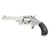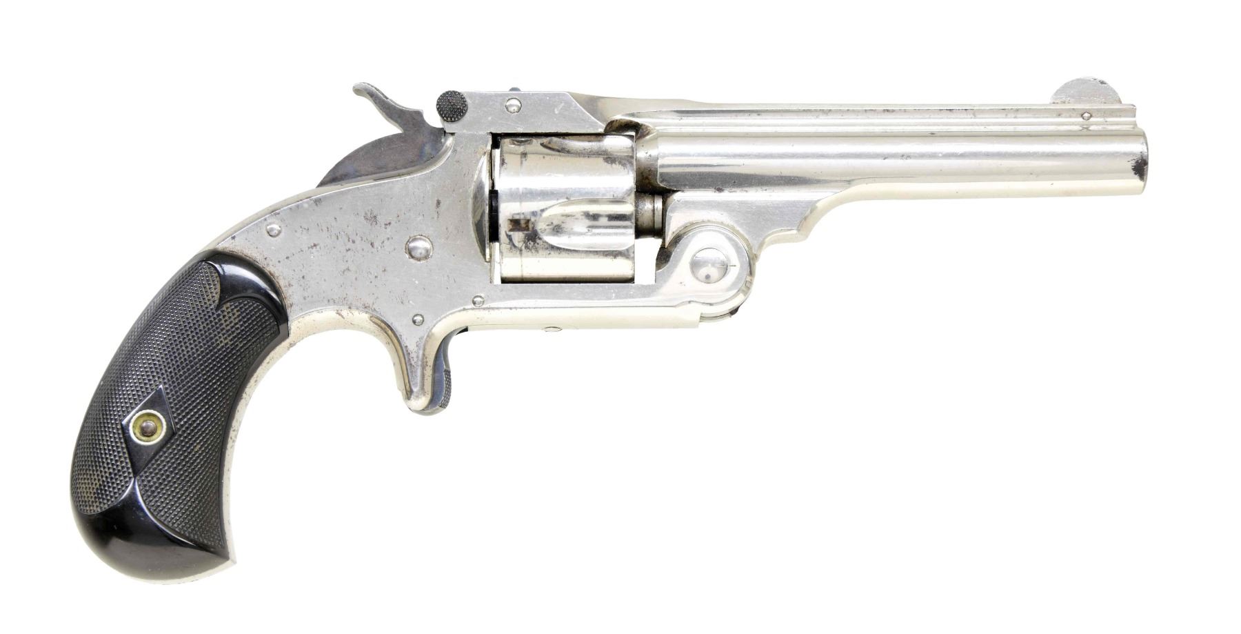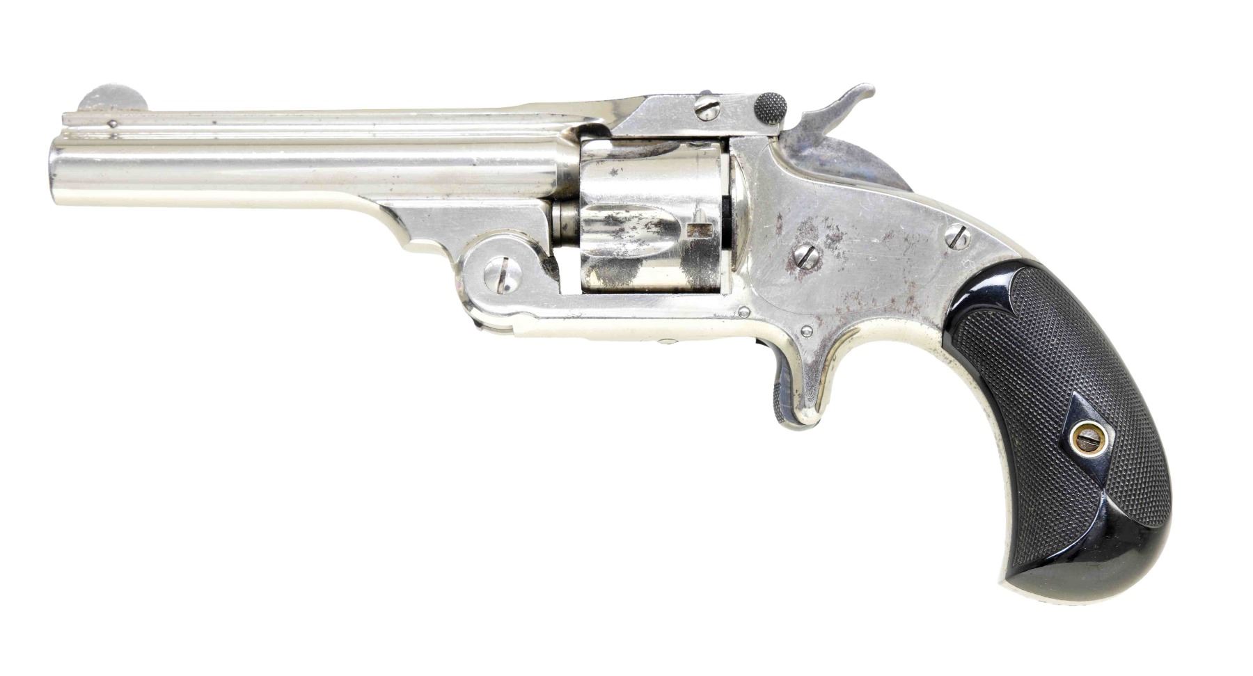 Cal. 32 S&W. S# 1309. Bbl. 3 1/2". Round blade front sight. V-notch rear sight. Matching numbers on grip frame, bbl., and cyl. Early model w/ V-shaped patent markings. Nickel finish w/ case-colored trigger & hammer. Checkered black grips w/ pencil-matching right panel. CONDITION: grips show some dirt staining and handling marks. Hammer & trigger retain strong traces of case colors w/ scattered fading to gray and oxidation. Balance of metal retains 85% nickel w/ scattered flaking & oxidation. Bore shows scattered pitting but strong rifling. PROVENANCE: from the lifelong collection of Robert "Mike" Bricker. (01-25408/MJC). ANTIQUE. $300-500.