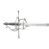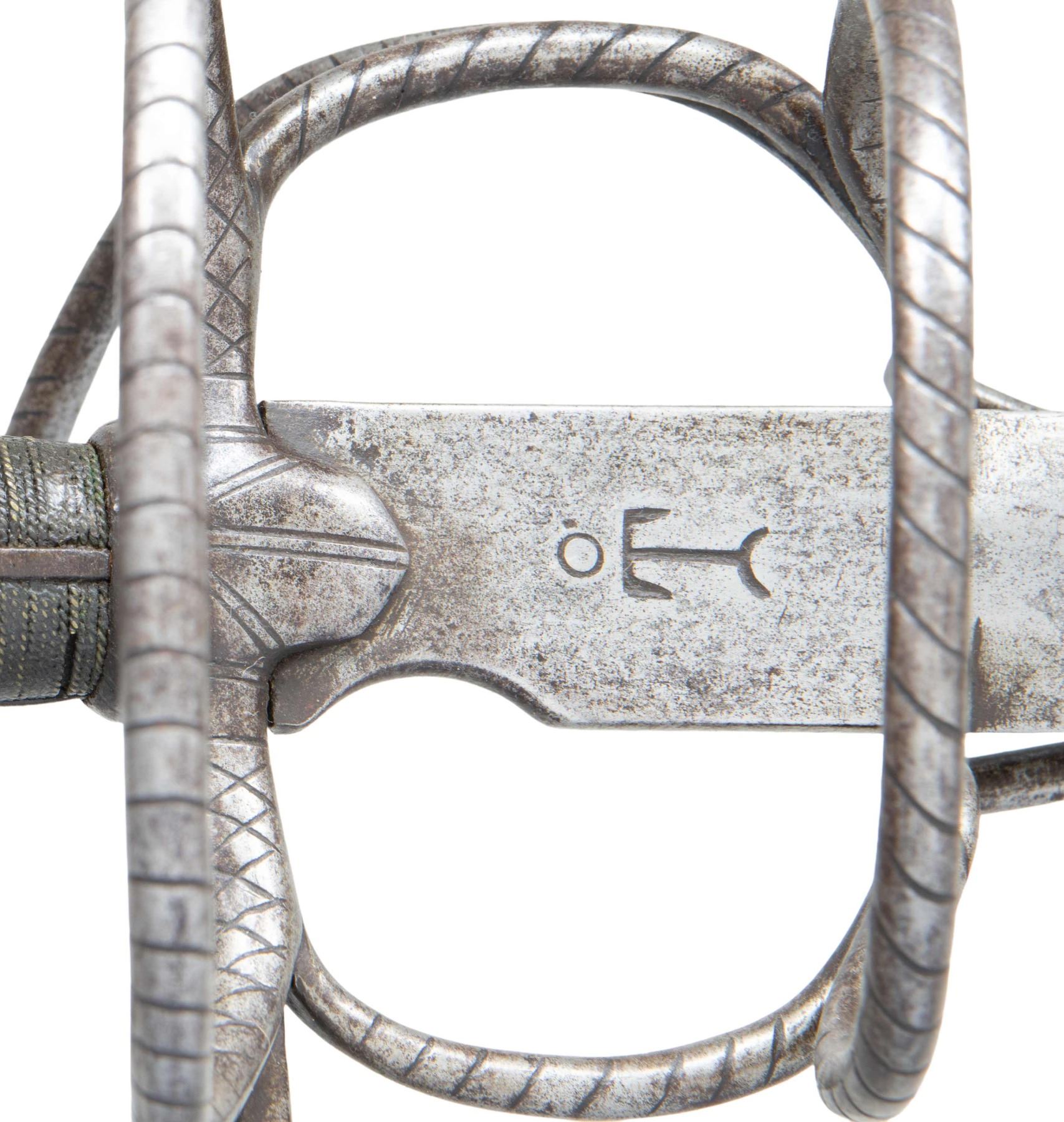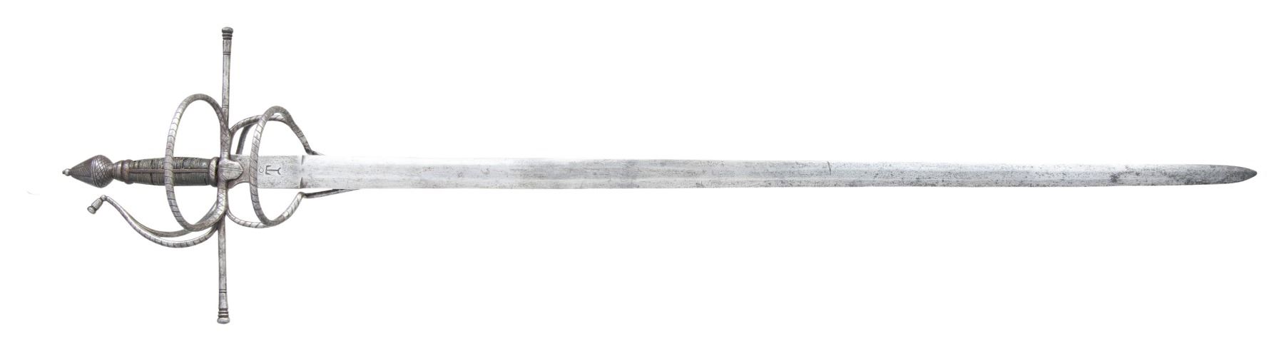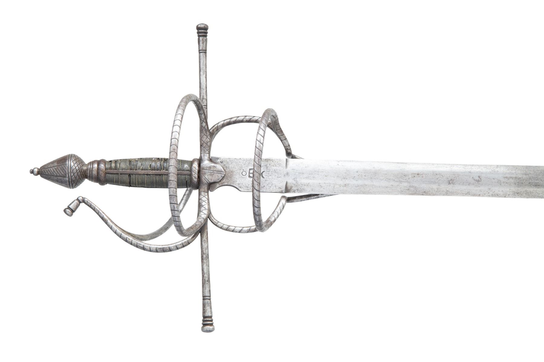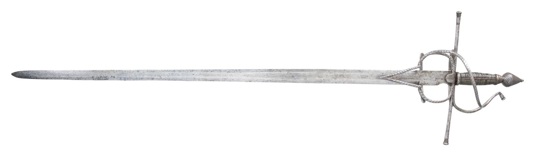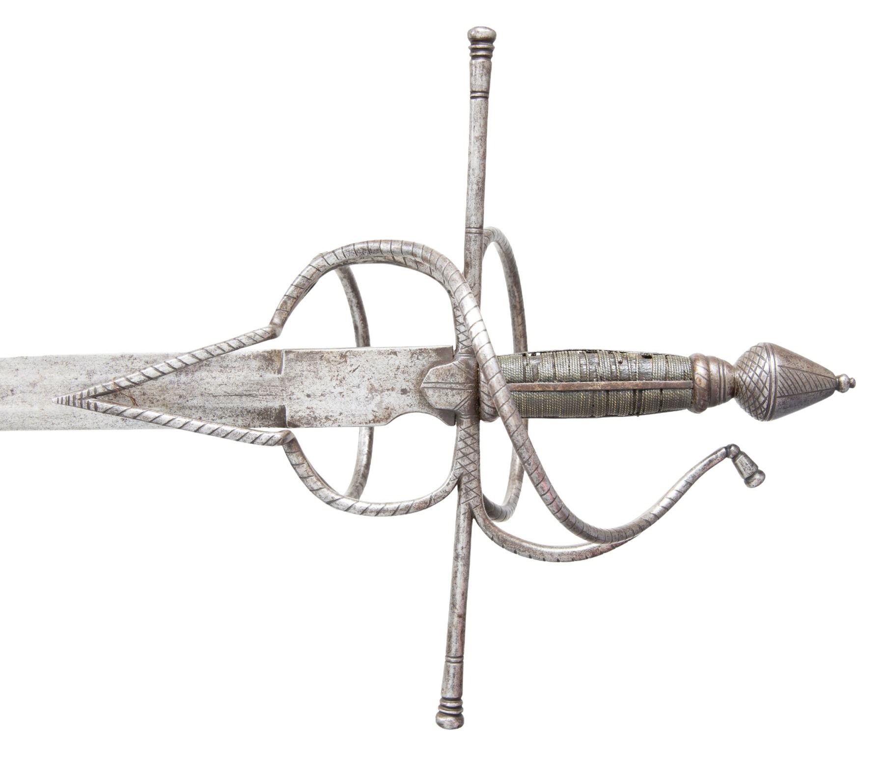 A very nice example of an early style German swept hilt broadsword from the 16th to the mid-17th century that was likely recreated during the Victorian era or later. The sword measures 46" overall with a 39 1/4" double edged blade. The blade has a very slight fuller extending 15" up the blade with a single armorer's mark on the ricasso. The crossguard is 12" across and there is a double ring and a sweeping loop guard. Large conical style pommel with incised lineal design. Quartered wire wrapped grip with a ferrule and cap. CONDITION: The sword has a lightly mottled medium gray patina with some minor variation. The wire wrapped grip has losses. PROVENANCE: Estate Collection of Nicholas Apergis. (02-24774/BF). NON-GUN. $400-700.