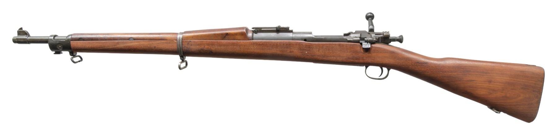 MILITARY RIFLE. Cal. 30-06. S# 3103334. Bbl. 24". Marked behind front sight "RA / flaming bomb / 5-42". Rifle was made by Remington using machinery supplied by Rock Island Arsenal & incorporates a number of production simplifications including the receiver tang drilled through, rear sight base w/o lightening cuts & a generally coarser machined finish. Ladder rear sight w/o volley notch. Remington marked windage knob. Blade front sight. Receiver has Hatcher hole. Bolt w/ straight down handle is marked on top of safety lug w/ "625". Bolt has single small gas hole. Cutoff is marked "R". All milled furniture including fine checkered trap buttplate. Trigger guard marked "R" on right rear. Bbl. bands marked "R". Walnut stock set. Buttstock is straight grip 1903A3 type w/ pinned reinforcements. CONDITION: stock set has lightly worn finish w/ scattered handling marks. Metal retains a very large degree of its arsenal rework parkerization except the replacement lower band has a overall gray finish. Very good shiny four-groove bore. (25-2800/RW). CURIO. $400-600.