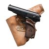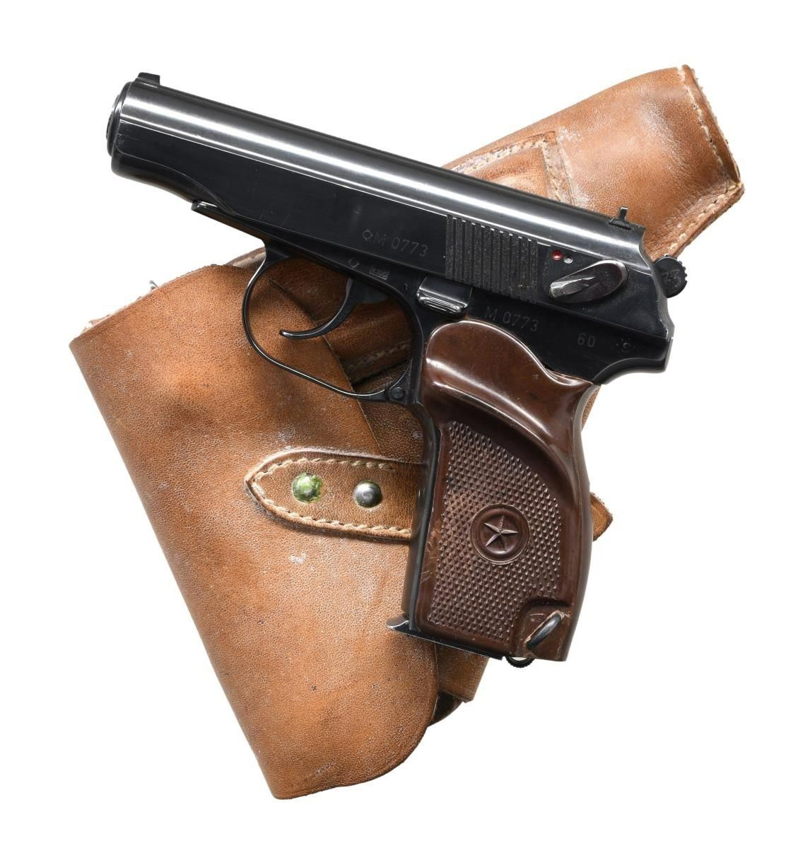 Cal. 9x18 Mak. S# M0773. Bbl. 3 3/4". Blade front sight. Square-notch rear sight. Mfg. 1960. The right side of the frame has Century import markings. The back of the hammer bears the electro pencil number "33." Checkered brown bakelite grips with Communists star and left-side thumb cutout. MAGS: 2-8 rd. One of the mags has the electro pencil number "06." UNATTACHED ACCESSORIES: surplus Makarov holster that shows crazing and scattered white staining. CONDITION: grips show white staining, dings, handling wear, and some light chipping. Metal retains 90% arsenal blue with some light edge wear, white staining, and scattered light oxidation. Very good bore. PROVENANCE: the Lifelong Collection of Terrance McCarty. (24-138/MJC). CURIO. $300-400.
