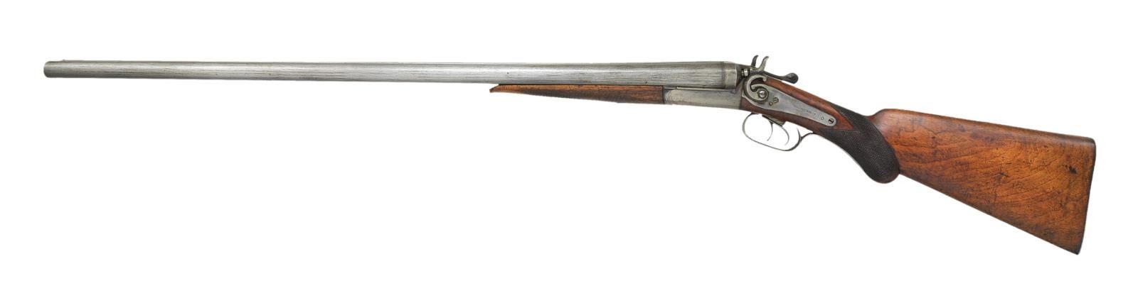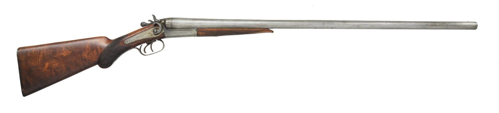 Cal. 12 Ga., 2 1/2". S# 74934. Bbls. 30" of Belgium Laminated Steel. Cyl. & Cyl. chokes. Steel front bead. Rnd. bodied exposed hammer top lever action w/ back action locks. Under lug locking w/ doll's head extension. Dbl. triggers. Extractors. Splinter forearm & rnd. knob walnut stock w/ hand checkering. LOP: 14 1/8" over grooved steel buttplate. CONDITION: bbls. have cleaned gray appearance. Action retains light case colored in protected areas blending to gray showing areas of cleaning. Firing pins appear to be replacement, right extends past breech face, left firing pin retainer is partially unscrewed from action. Refinished wood show scratches & marks. Bores show scattered light pitting. (21-2854/DS). CURIO. $125-200.