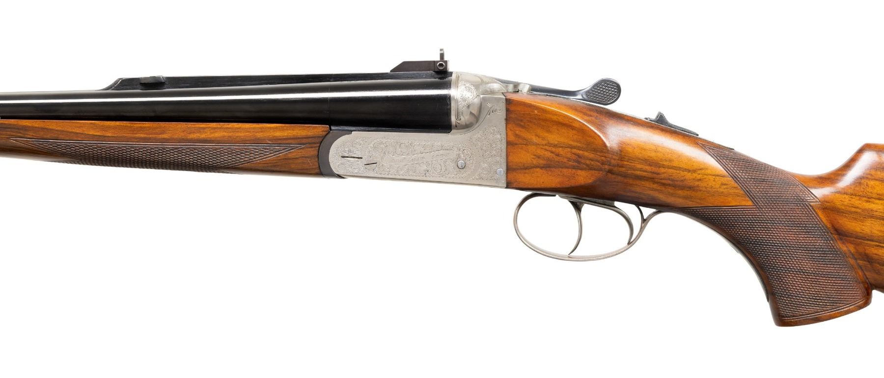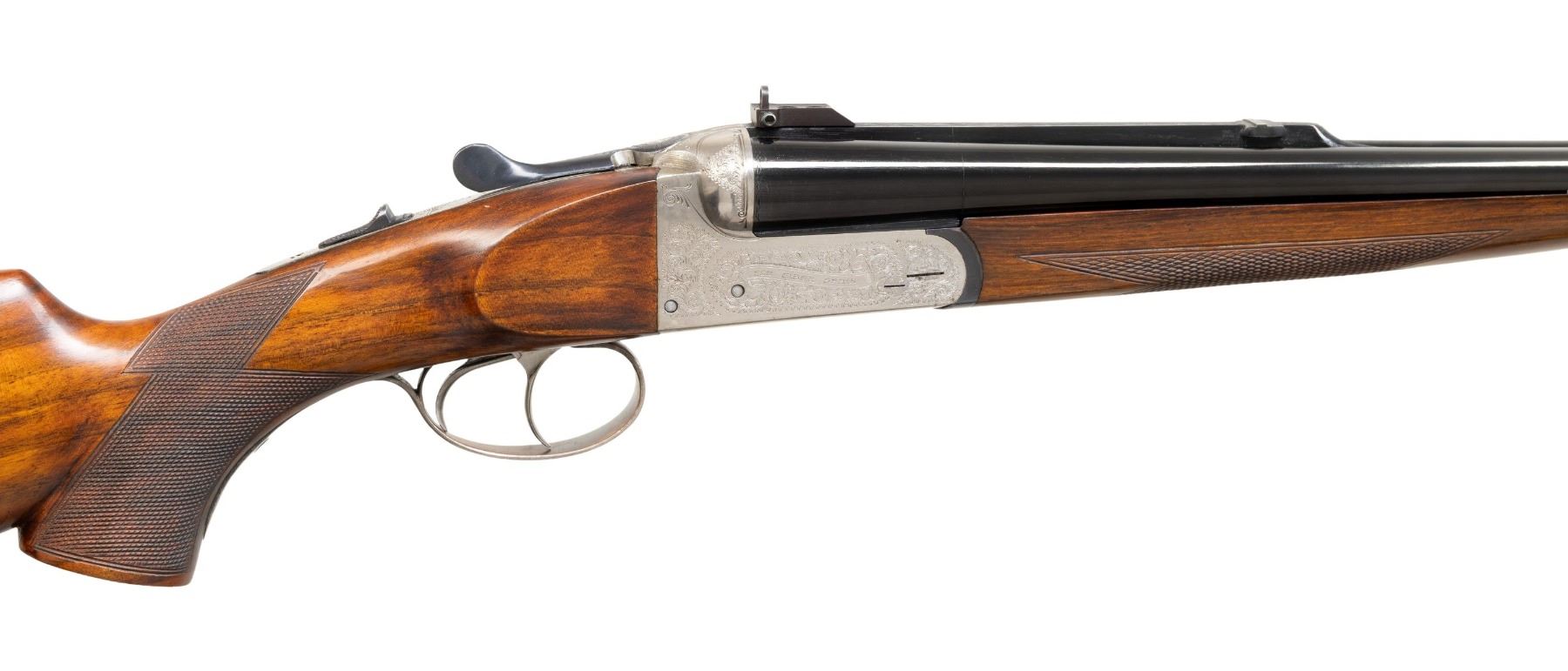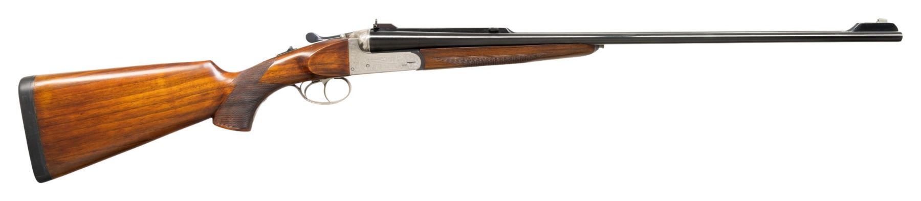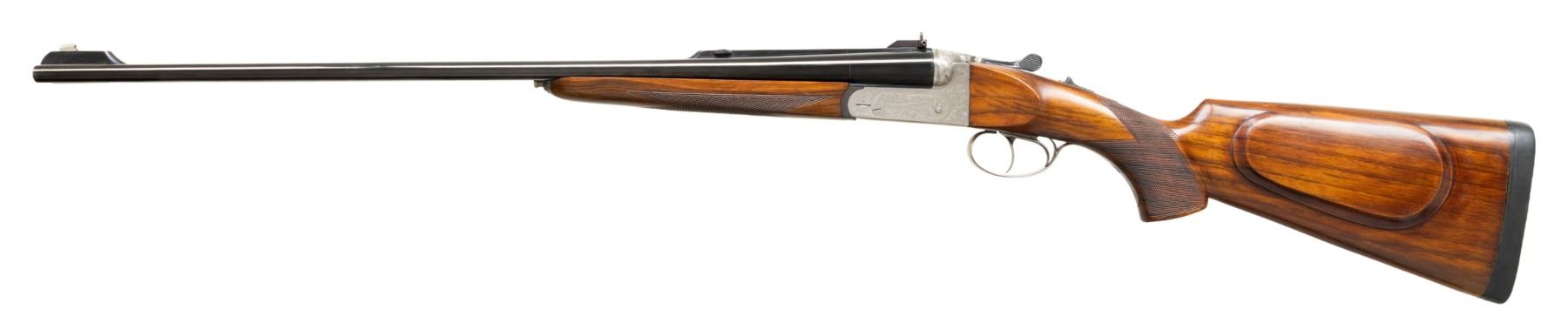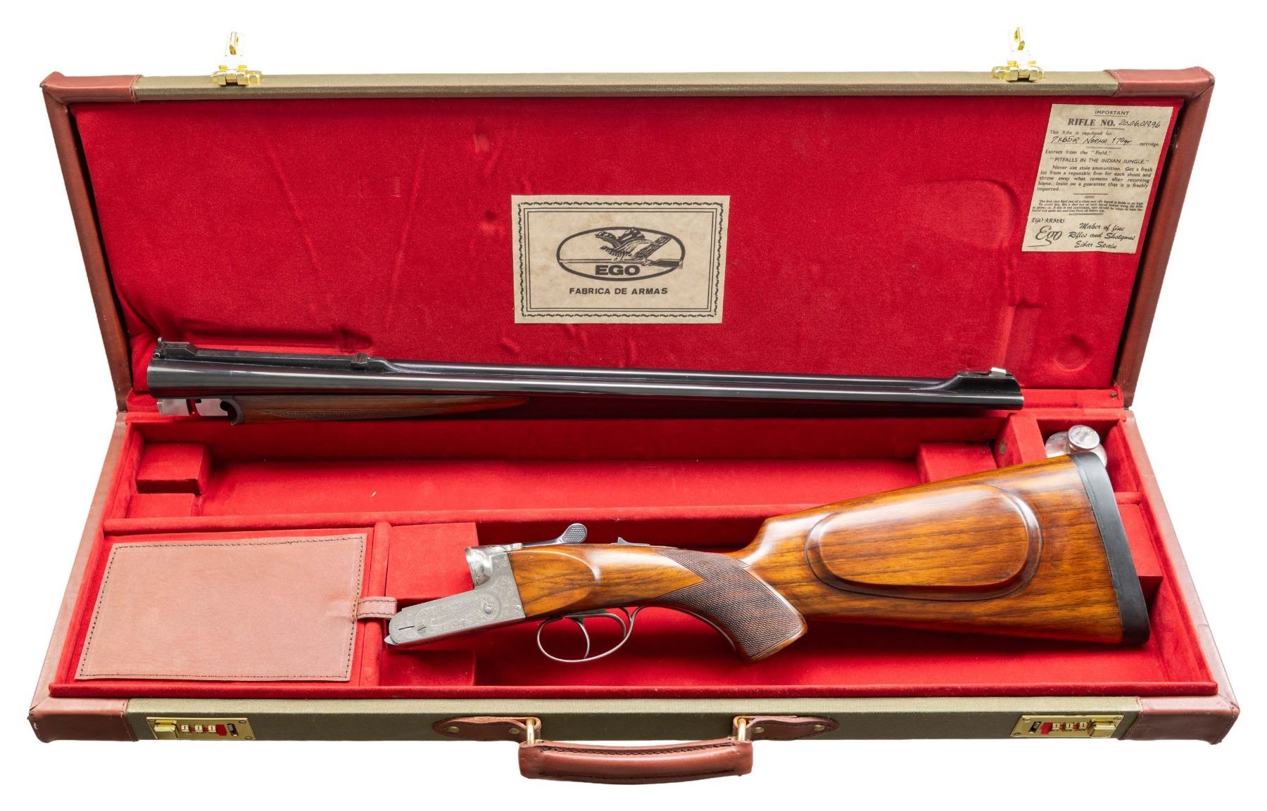 Cal. 7x65R. S# 20-06-JZ019-96. Bbls 24 7/8" monobloc with sunken rib having raised front and rear sight ramps. Blade front sight with filler in front dovetail on the rear sight ramp having and adjustable circular peep sight at rear of ramp. Bright finished boxlock action with rose and scroll engraving. Sides of action has banners marked "EGO EIBAR SPAIN". Dbl triggers, front trigger is hinged. Selective ejectors. Splinter forearm and pistol grip, cheekpiece walnut stock have point pattern hand checkering. LOP: 14 5/8" over an aftermarket solid black pad. DAC: 1 7/8". DAH: 2 5/8". Stock has a slight cast off. WEIGHT: 8lbs, 6.4oz. UNATTACHED ACCESSORIES: canvas covered case with leather trim. Red felt interior has maker's labels and contains an oil bottle. CONDITION: bbls and action retain over 98% finish. Stocks have good finish showing scattered small marks and dents. Action is tight and on face. Very good bright bores. PROVENANCE: From the Buckstix Collection. (25-6360/DS). MODERN. $3,500-5,500.