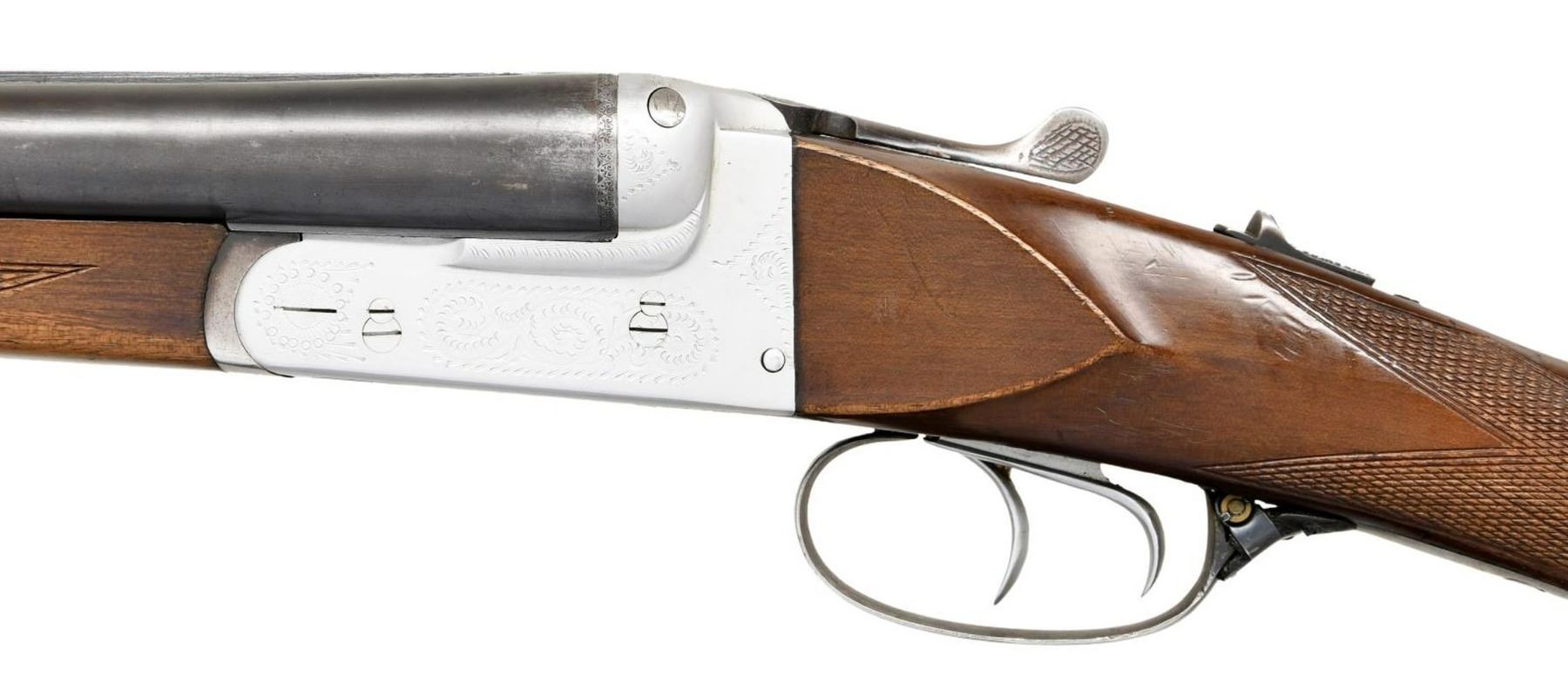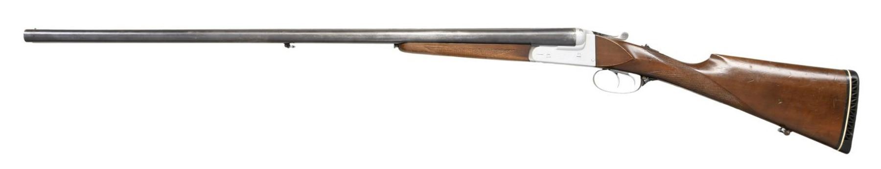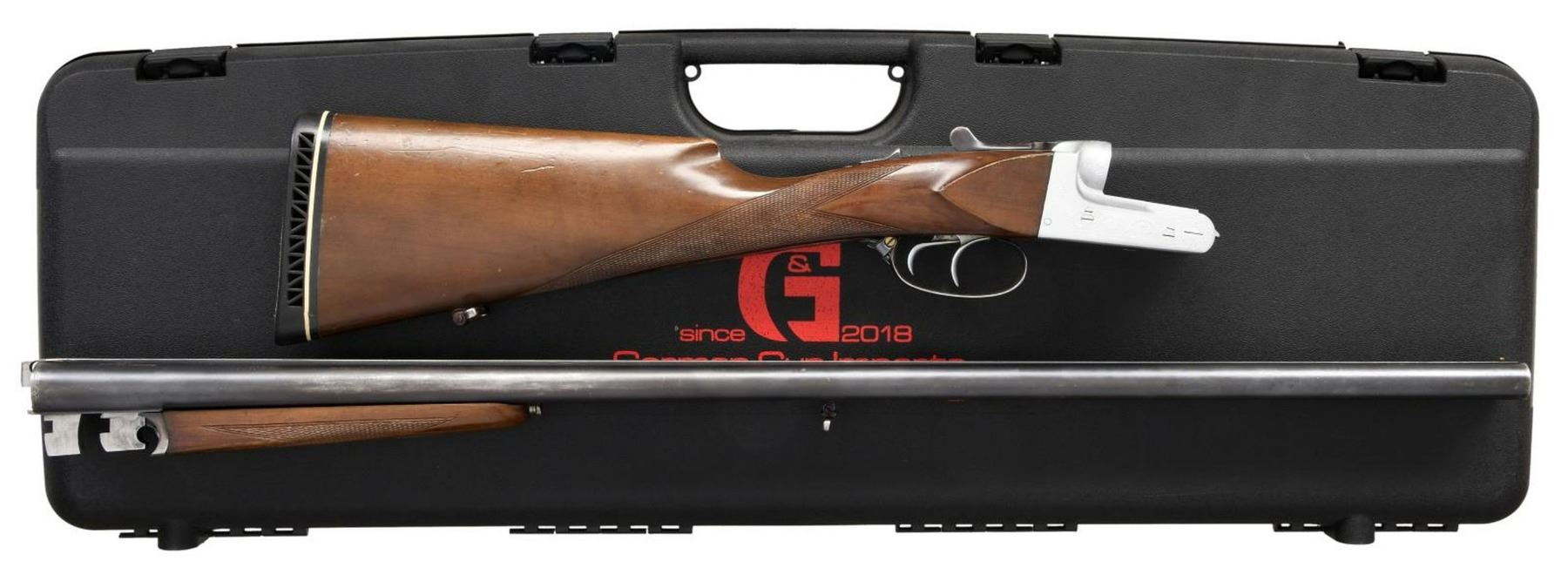 Cal. 16 Ga. S# 52882. Bbls. 30" serrated solid rib w/ front brass bead & choked “FULL” & “IM”. Chamber forcing cones appear reamed out from original 2 3/4". Matching S#s. Dbl. triggers & extractors. Scroll engraved coin finished frame w/ blued Bbls. Checkered splinter forend & straight grip buttstock w/ high comb, sling swivels & 12 3/4" & 13 1/2" LOP to added recoil pad. Importer marked. UNATTACHED ACCESSORIES: black plastic case. CONDITION: homemade repair at rear of triggerguard. 70% fading blue, frame has a few scattered marks & stock set has an added coat of varnish over numerous dings & dents. Bores are fairly bright w/ scattered light pitting, more moderate in left breech end. Chamber forcing cones appear reamed out. PROVENANCE: "Save the Fine Guns". T&G German Gun Imports, bringing fine German guns to a more appreciative market. (23-1452/CW). MODERN. $100-200