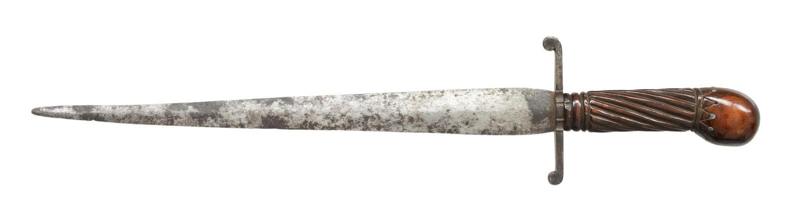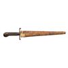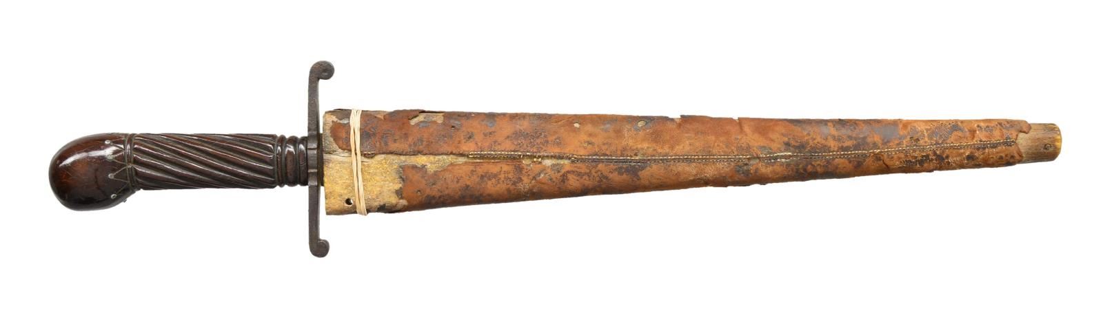 BONE SHEATH. 19.5” overall, 14” double edged dagger blade, 4” sculpted crossguard, finely carved spiral ribbed handle, carved silver pinned knob. Rarely is 2 piece carved bone sheath body attached with wood pegs and covered in leather veneer. CONDITION: good very good overall, mottled gray/white blade with staining and pitting, wood grip As age cracks over surface of knob, sheath is solid, 2 wood pegs missing, leather veneer dry and cracking and missing about 25% overall. (02-18187/JS). $2,000-2,500.