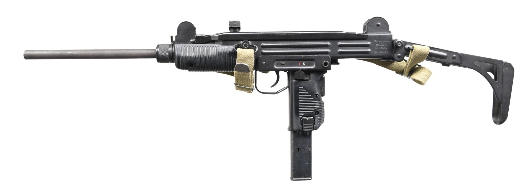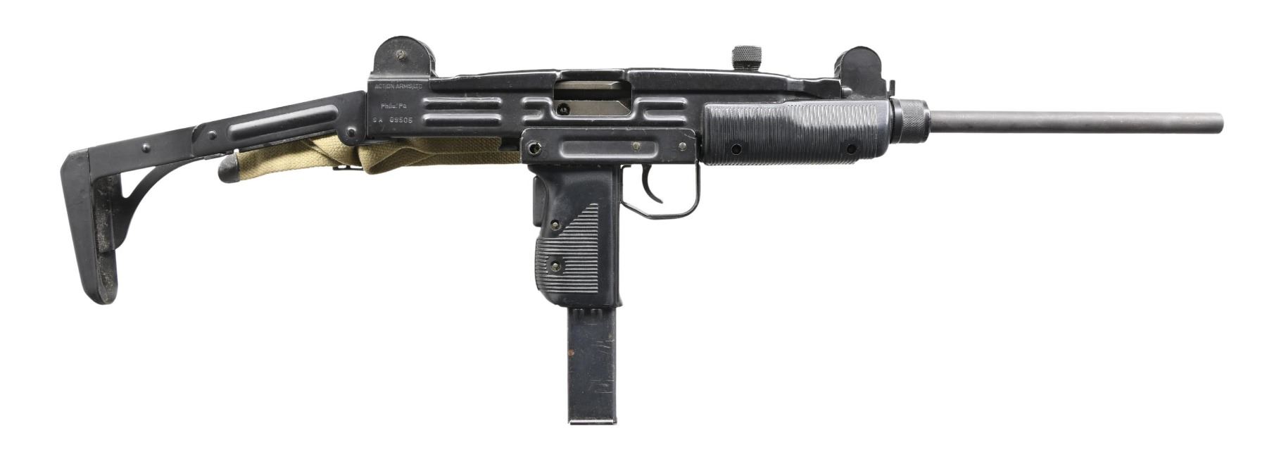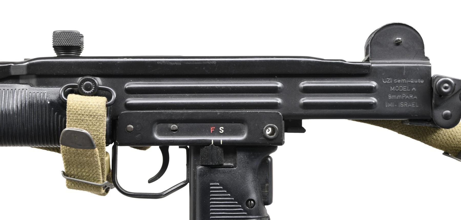 Cal. 9mm. S# SA09505. Bbl. 16". Mfg. Action Arms IMI. UZI model A semi automatic carbine. The first closed bolt semi automatic version of the world-famous SMG. Fitted w/ factory collapsible stock. Front sight elevation & windage adj. protected post. Non adj. rear sight, flip up dual aperture peep sight marked "100" & "200". Classic black painted finish on most exposed metal parts. F-S trigger group. Rotating sling swivel on left side of receiver. Black plastic furniture. The Model A is a bit more elusive & sought after than the more common Model B, though the differences are quite subtle. They include a bolt mounted firing pin safety block & the sling swivel rotates only 90 degrees compared to 180 degrees on most Model Bs. The only other notable differences are in the sighting system where the front sight is also adj. for windage in the Model A & the rear sight has no adj. beyond selecting the proper aperture. Tan canvas sling. MAGS: 1 steel 32rd.. CONDITION: Finish complete & consistent w/ only light marks visible under close inspection. Bore is bright w/ strong rifling. Fire control mechanism appears to function properly when cycled by hand. PROVENANCE: Lifelong Collection of Terrence McCarty. (24-306/JZ). MODERN. $1,300-1,800.