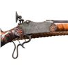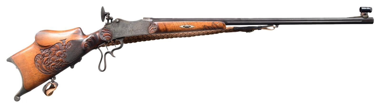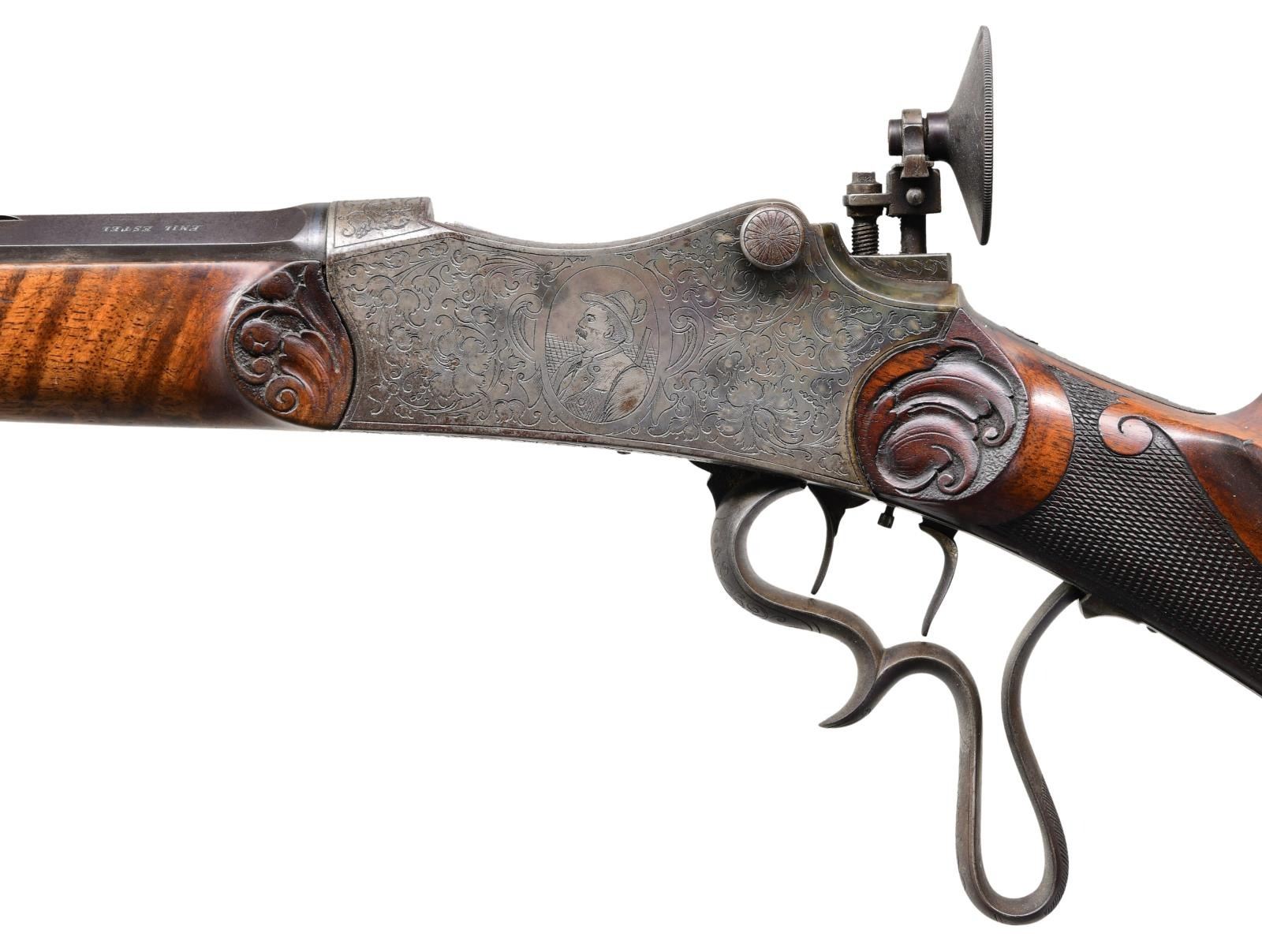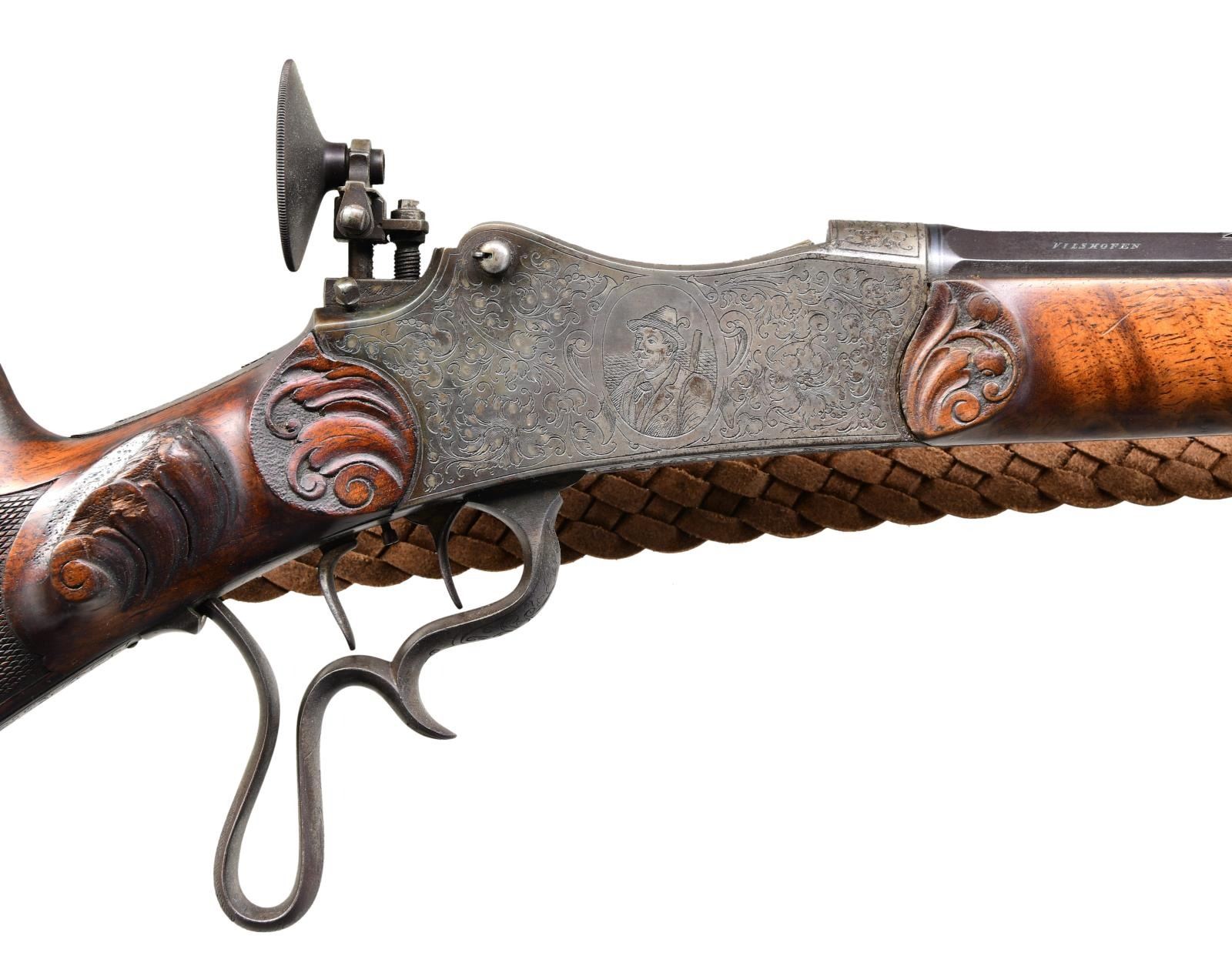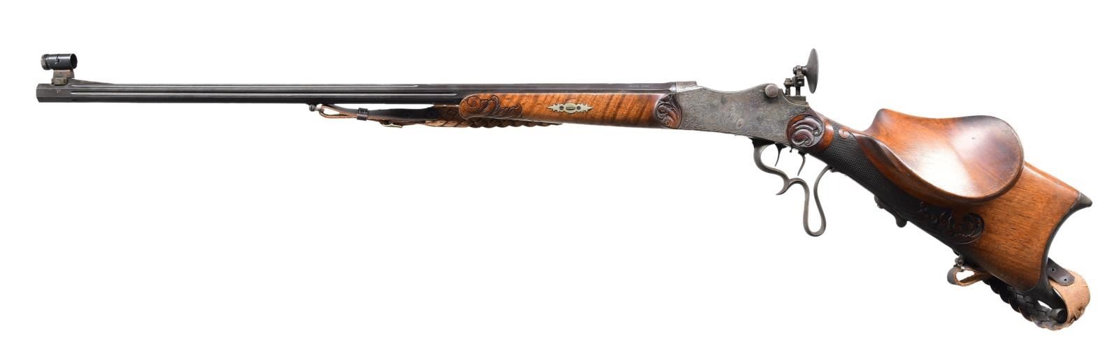 SHOT RIFLE. Cal. 8mm CF (Likely 8.15x46R. S# 45. Bbl. 28 1/2" oct. fluted configuration w/ matted top flat. Bottom flat of bbl. has crown over "B", "U" & "G" proof marks. Marked 1/72,28 over "8.04" over "384" followed by apparent serial number "45". Left flat has silver inlaid marking "EMIL ESTEL". Right flat marked "VILSHOFEN". Martini type action w/ finger curl lever. Double set triggers. Sides of action feature vignettes of Schuetzen participant in traditional garb w/ silver inlaid highlights. Scenes are surrounded by vine type floral scroll w/ silver inlaid flowers. Matching scroll extends to upper & lower action areas along w/ buttplate tang. Large disc tang sight w/ replacement ramp mounted globe sight. Schnable tipped wedged fastened forearm & Schuetzen style walnut stock w/ large dished cheekpiece having thumbrest on right side. Stock is checkered at wrist & bordered by deep relief foliate carving that extends to forward area of stock, front & rear forearm areas. Steel Schuetzen buttplate w/ hooked toe & modern woven leather sling on original slings. CONDITION: bbl. has lightly faded brown finish. Action retains traces of case colors w/ balance fading to gray. Wood has worn original finish showing numerous scratches & marks. Action & triggers function when hand cycled. Bore is dark w/ worn rifling. (24-2206/DS). CURIO. $3000-5000.