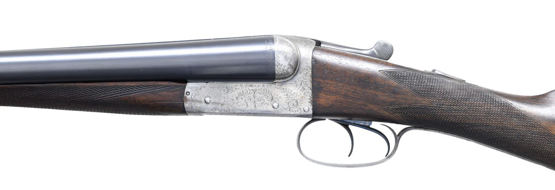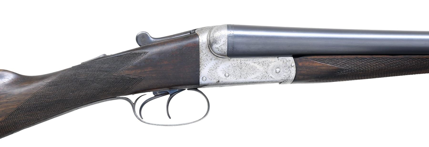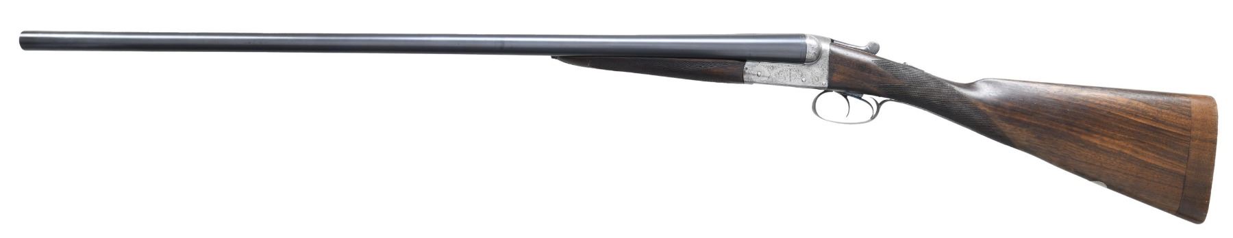2 1/2" CHAMBERS SXS GAME GUN. Cal. 12 Ga., 2 1/2". S# 35543. Mfg. approx. 1907 with Modern London Nitro Proofs indicating professional refinish. The 30" barrels have swamped game rib having bright bead partially discernable "EM REILLY & CO 295 OXFORD ST LONDON" address. Breech end of rib, forearm tip & top lever has gold inlaid "1" indicating once apart of a pair. Fixed IC & Mod chokes. Boxlock action has sprays of acanthus scroll engraving that extends to barrels, triggerguard, floorplate & top lever. Point pattern checkered walnut forearm with push button release. Point pattern checkered straight grip walnut stock w/ German silver nameplate on toeline. LOP: 14.25" to checkered butt of added 1 1/4" piece of walnut. WEIGHT: 6 lbs., 7 oz. CONDITION: Very good re-freshened barrels showing light handling wear & occasional spot of oxidation along forearm channel. Action has bright appearance with good blue on floorplate & triggerguard showing worn finish in carry areas. Stocks have been lightly sanded & refinished with recut checkering. Small cracks on forearm extending from iron. Shiny bores with fouling & spots of light pitting. Action appears tight on face to barrels & ejectors appear in time. (24-6951/MD). MODERN. $500-900.