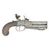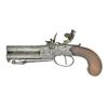 PISTOL. Cal. .45. NSN. Superposed 3" barrels numbered "1" & "2"; respectively numbered on left side frame. Spring loaded 3" bayonet retained by latch on triggerguard; triggerguard slides rearward to release bayonet tip. Boxlock center hammer action w/ toggle on left side corresponding to bottom barrel touch hole. Patriotic motifs on both sides of action marked "Knubley" on let side & "London" on right side. Top tang has sliding safety latch. Bag type walnut grip. CONDITION: metal has gray/brown patina appearance w/ light pitting & marks throughout; deeper pitting around left side pan. Grips have good varnish with deep impressions, scratches, gouges & sm. chip missing right side by triggerguard. Fair bores w/ light pitting. (01-23088/MD). ANTIQUE. $500-800.