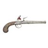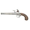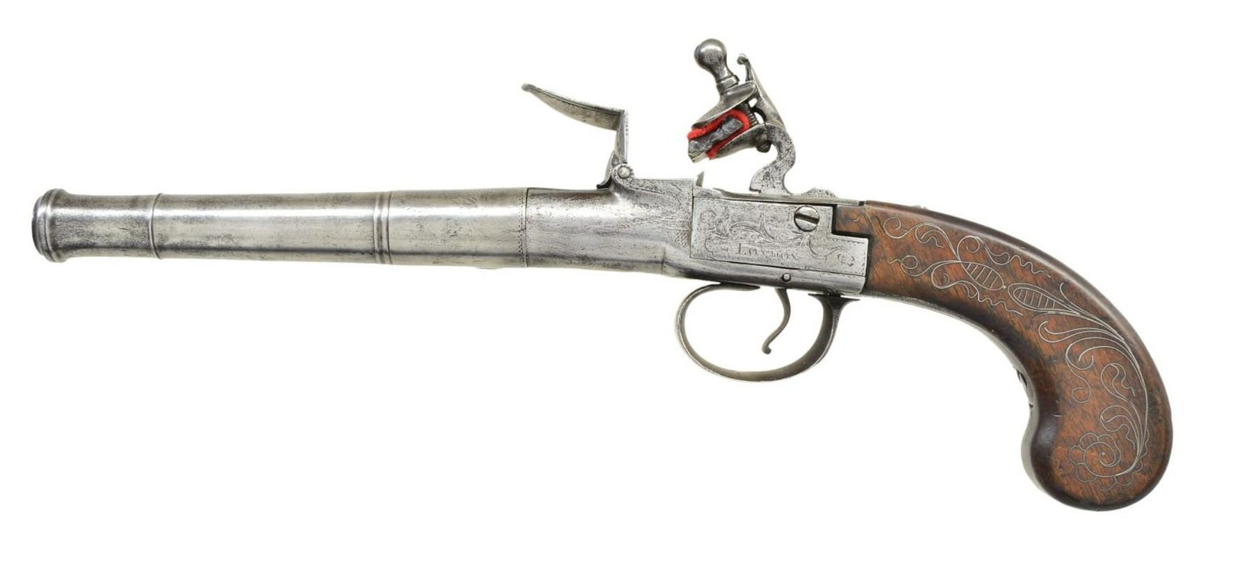 FLINTLOCK PISTOL. Cal. 60. NSN. Circa 1750 pistol by Joseph Clarkson of London. Cannonade style 5 3/8" screw on bbl. Boxlock action w/ center hammer, scroll engraving & London "V" & "CP" proofs on bottom. Engraved on left side "LONDON" & right side "CLARKSON". Triggerguard bow slides as safety for hammer. Walnut bag style grip with scroll wire inlays. CONDITION: metal has gray patina appearance w/ light pitting, scratches, worn engraving & dents. Corrosion & pitting in pan. Grip is shrunk at action with repaired break on left side. Sanded & refinished varnish showing gouges & impressions. Hammer will not hold in cocked position & triggerguard bow will not keep hammer in safety. Fair lightly pitted bore. PROVENANCE: From the Collection of James B. Taylor. (01-23093/MD). ANTIQUE. $600-900.
