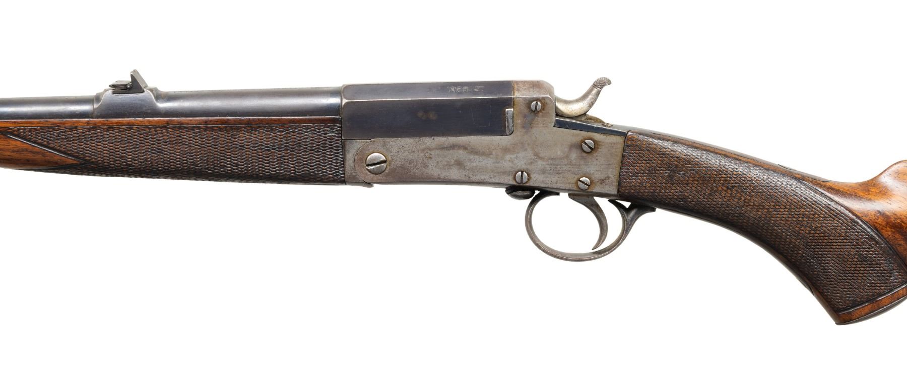 WEBLEY PATTERN ROOK RIFLE. Cal. 255 Jeffrey. S# 9885 (assembly # 83956). Rnd. 26"; has been relined & reproofed . Blade front sight & 3 leaf rear sight. Boxlock action w/ side lever & extractor. Replacement checkered walnut stock set w/ grooved butt & German silver toeline nameplate. CONDITION: good barrel blue showing large areas of fading finish mixing with gray patina showing scattered peppery oxidation & scratches. Right side of action has good case colors with balance fair fading colors mixing with brown patina, peppery oxidation & scratches. Lightly sanded & refinished wood shows scattered light dings. Shallow rifling shows pitting. PROVENANCE: Estate of Groves Herrick. (25-5717/MD). CURIO. $500-800.