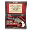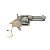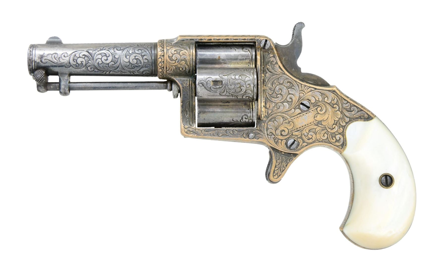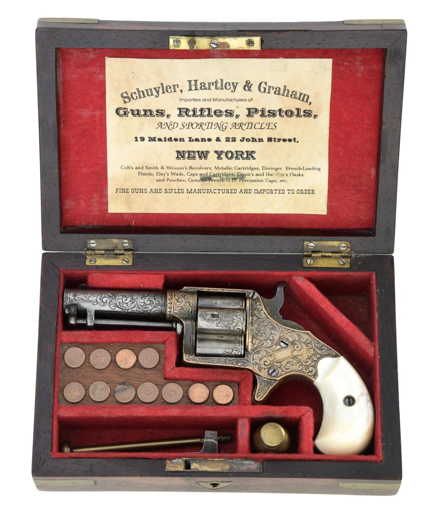 Cal. 41 RF. S# 261. Bbl. 3" round w/ Hartford address & semi-circular sight. Distinctive 4 shot cloverleaf cyl. Brass frame w/ spur trigger. Frame, cyl. & bbl. have nearly full coverage of foliate scroll New York style hand engraving. Silver finish w/ gold finished hammer. 2 piece pearl bird's head grips. Mfg. 1871. UNATTACHED ACCESSORIES: trade casing w/ brass corners & rectangular plate on lid. Red felt fitted interior. Inside of lid has Schuyler, Hartley & Graham label. Case contains cartridge block w/ eleven rds of 41 RF ammo, brass oil bottle, cleaning rod & screwdriver. CONDITION: metal retains 25% silver finish. Very good grips. Hammer retains some gold finish in protected areas. Sound action. Lightly pitted bore retains sound rifling. PROVENANCE: From the Collection of a Tennessee Gentleman. (01-25648/DS). ANTIQUE. $5,000-8,000.