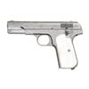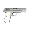 PISTOL. Cal. 32 ACP. S# 7352 (1904). Renickel finished pistol has generous coverage of aftermarket rose & scroll engraving. Top of slide has two engraved motifs with stippled backgrounds; a spread wing eagle & a 5 pointed star surrounded by oak leaf borders. 4" Barrel. Two piece Mother of Pearl grips. MAGS: 1 - 8 rd. CONDITION: good renickeled metal finish. Good grips w/ tarnishing on right panel. Fair bore w/ ring bulge 1" from muzzle & pitting. (24-1069/MD). CURIO. $400-600.