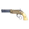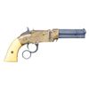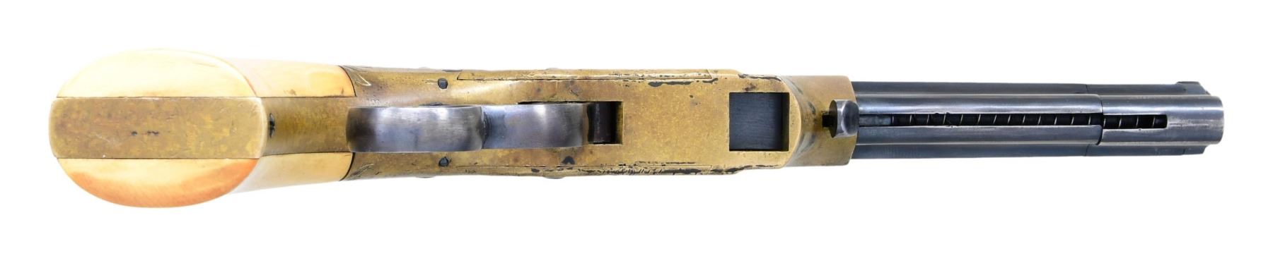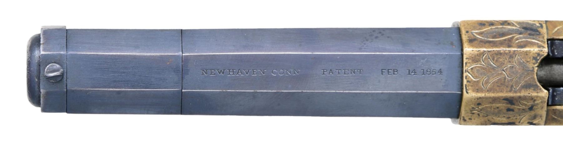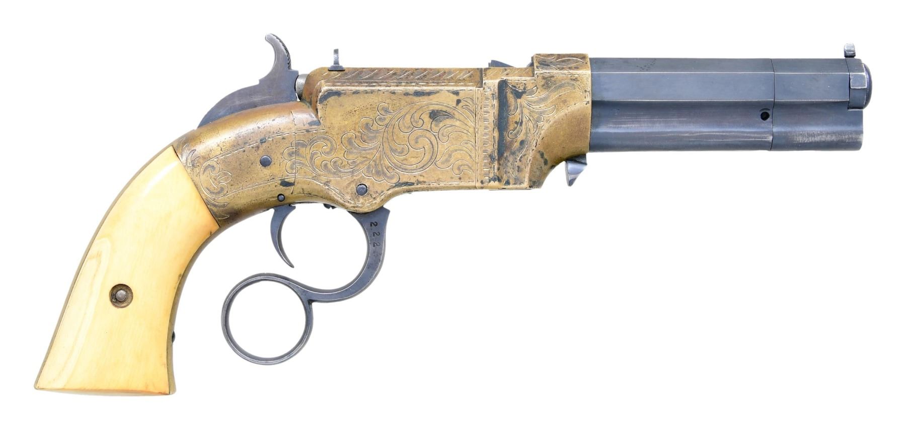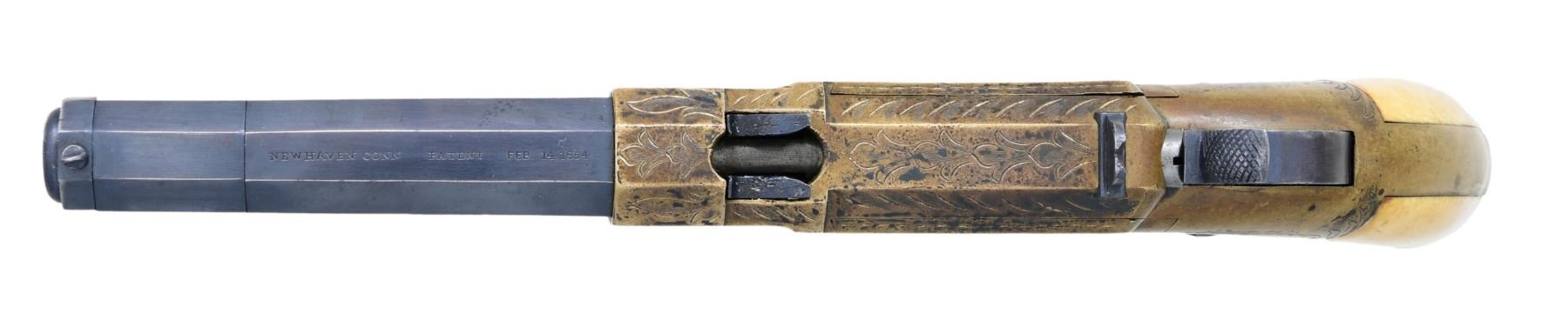 ACTION PISTOL. Cal 31. S# 1471. Manufactured between 1857-1860 after the breakup of Volcanic Arms Company by newly formed New Haven Arms Company, continued making same design for the self-contained "rocket ball" cartridges. Standard configuration 3.5" octagonal barrel, integral 6-shot spring loaded magazine, "Volcanic" dropped in address "NEW HAVEN CONN" PATENT FEB 14 1854" stamped in one line on top flat, fixed notch rear sight, pinched post front sight, brass frame, ivory grips. CONDITION: very good overall as refinished, custom engraved after manufacture, address freshened, about half dull reblued finish retained, brass mottled patina, grips well fit. Mechanics good, crisp rifled bore. "222" stamped on lever. (01-26629/JS). ANTIQUE. $2,000-4,000.