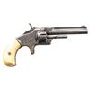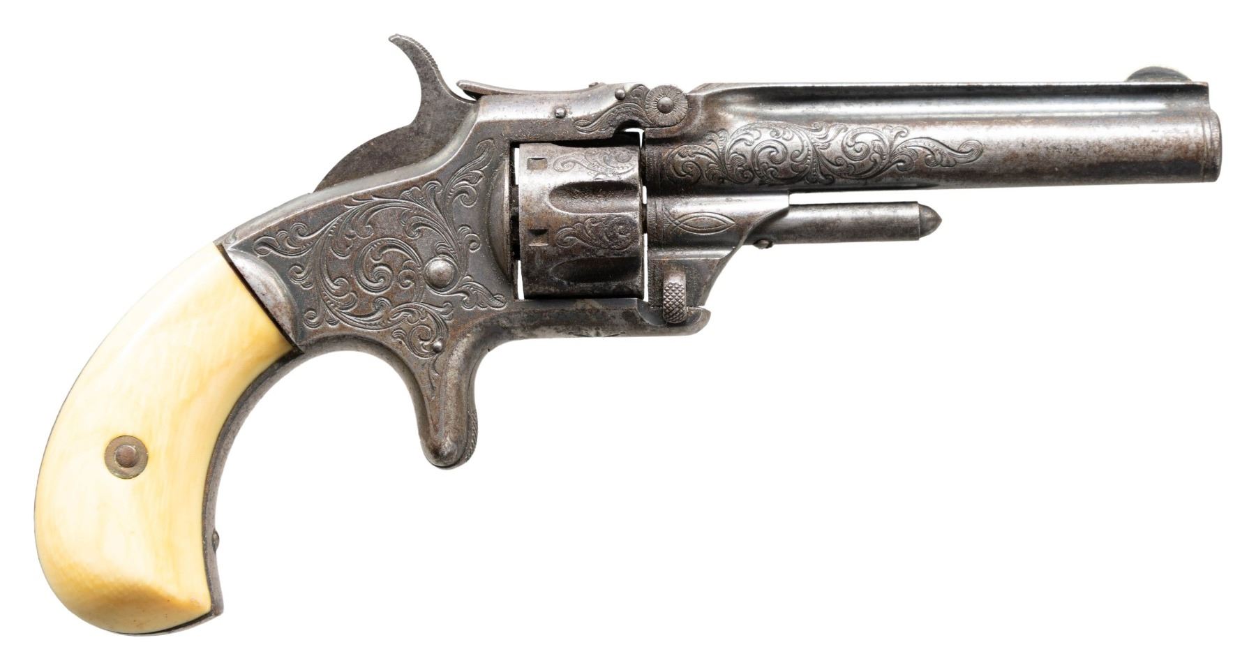 Cal. 22 S. S# 24913. Bbl. 3 1/4". Round blade front sight. Matching assembly numbers on grip frame, bbl. & cyl. S&W No. 1 second issue revolver. Revolver has floral engraving with about 2/3's coverage. Cream colored grips. CONDITION: grips show some handling & age wear with a couple thin cracks above right screw hole. Metal is an overall dull gray patina with scattered oxidation, edge wear & some old light pitting. Action is functional but cyl. is loose when locked up. Pitted bore with visible rifling. (01-28301/MJC). ANTIQUE. $1,000-1,500.