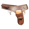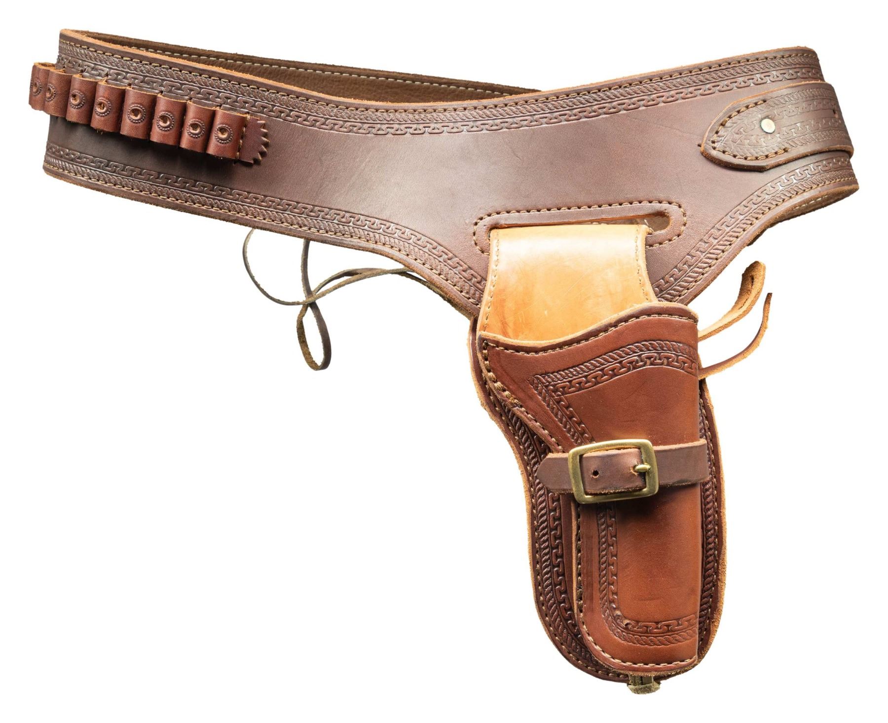Cal. 45 Colt. S# J89105. Bbl. 4 3/4". Blade front sight. Fixed rear sight. Taylor's 1873 SA revolver made by Uberti. Taylor's catalog # REV0410L06. Blued & case colored finishes with floral engraving. Walnut grips. UNATTACHED ACCESSORIES: matching numbered factory box, leather La Fair belt that does not appear to have a size marking but does have cartridge loops & right handed holster. CONDITION: all aspects near excellent. (25-6208/MJC). MODERN. $700-1,000.