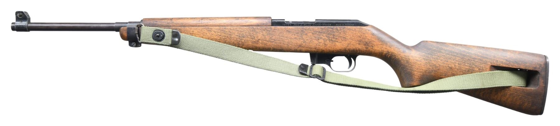 Cal. 22 LR. S# 19127. Import marked on bottom of bbl. Bbl. 17 3/4". Rear sight is not present. Blade front sight w/ protective ears. Receiver grooved for scope mount. Marked on left side "Mod. E M1. .22 ERMA-Werke Made In Germany". Hardwood stock & handguard. Green web sling. MAGS: none. CONDITION: stock set has light wear & scattered handling marks. Metal has moderate wear & loss of finish. Very good shiny bore. (25-2279/RW). MODERN. $200-400.