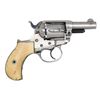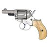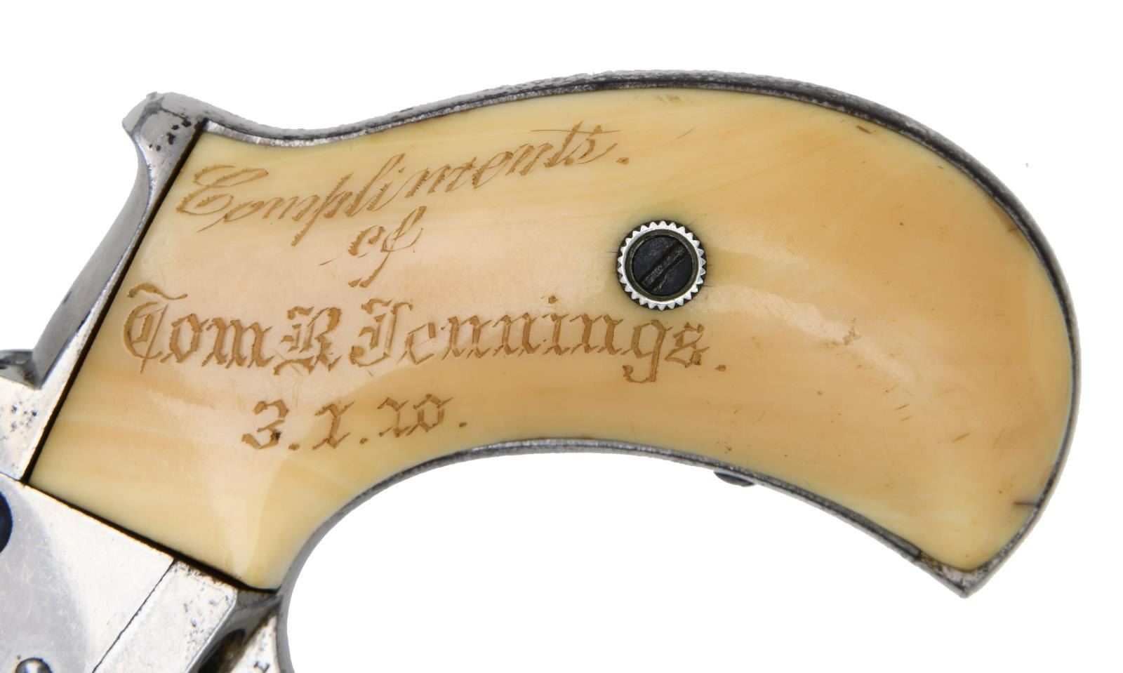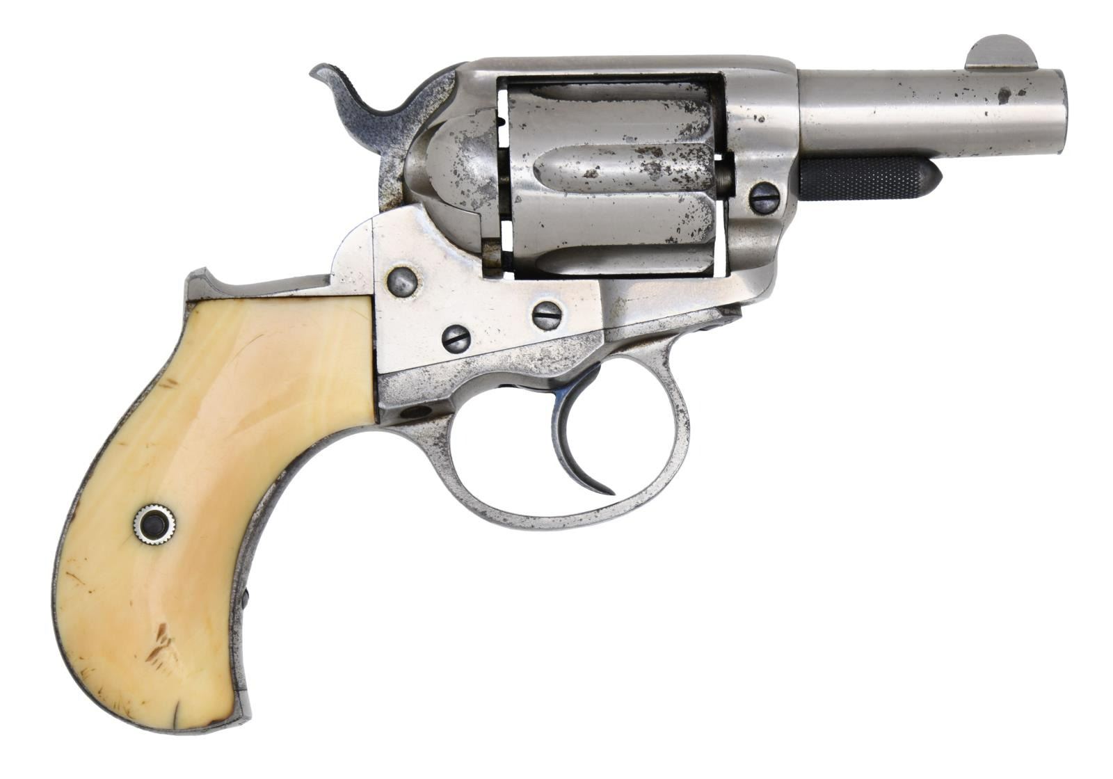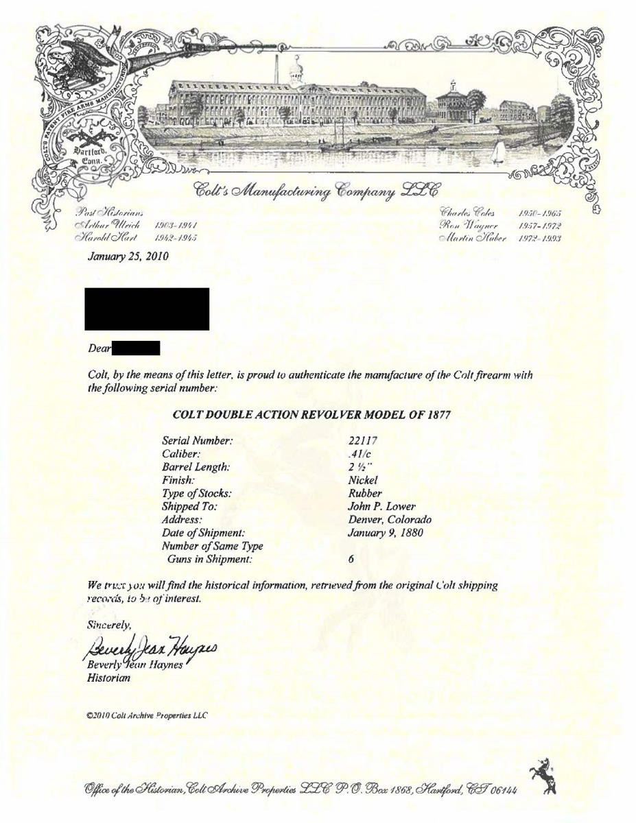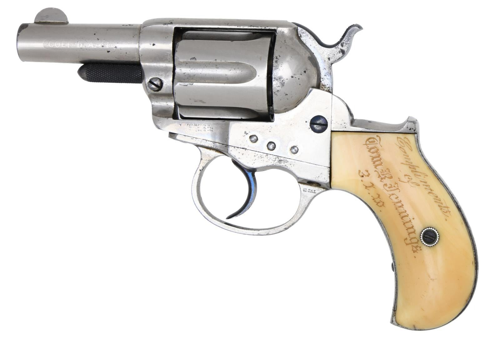 MODEL DOUBLE ACTION REVOLVER WITH INSCRIBED IVORY GRIPS & FACTORY LETTER. Cal. 41 LC. S# 22117. Bbl. 2 1/2". 1877 Thunderer Storekeepers Model double action revolver mfg. by Colt in 1880. The left side of the bbl. exhibits "COLT D.A. 41" within an acid etched panel having Colt's 2-line address marked across the top. Left side of frame is marked with Colt's patent information having "41 CAL" stamped on the rear trigger guard web. Major metal components exhibit a nickel plated finish, w/ some smaller components including the trigger, hammer, and frame screws exhibiting a nitre blue finish. Frame is mounted w/ 2-piece smooth ivory grips & the left grip panel being inscribed, "Compliments/ of/ Tom R. Jennings/ 3.I.W". Half-moon blade front sight plus a frame notched rear sight. All numbers are matching including the frame, trigger guard, rear grip strap plus cyl. UNATTACHED ACCESSORIES: factory letter indicates that this example was shipped with a 2 1/2" bbl., nickel plated finish, and rubber grips in a shipment of 6 revolvers to John P. Lower in Denver, CO on January 9th of 1880. CONDITION: metal components retain the majority of their original factory nickel plated finish, exhibiting scattered spots of bubbling and flaking overall that show through to a dark gray patina. Nitre blued components retain a mostly gray patina & the trigger plus hammer retaining fair amounts of their original factory finish. Very bright bore, exhibits some areas of light to mild pitting, while retaining well defined rifling throughout. Action functions and indexes appropriately when cycled by hand. Ivory grips exhibit a pleasing yellow patina plus exhibit some scattered marks from handling and storage, but otherwise remain sturdy & serviceable. A very nice example of a desirable Colt 1877 Thunderer Storekeepers Model having period inscribed ivory grips. (01-25275/MLW). ANTIQUE. $1,000-1,500.