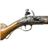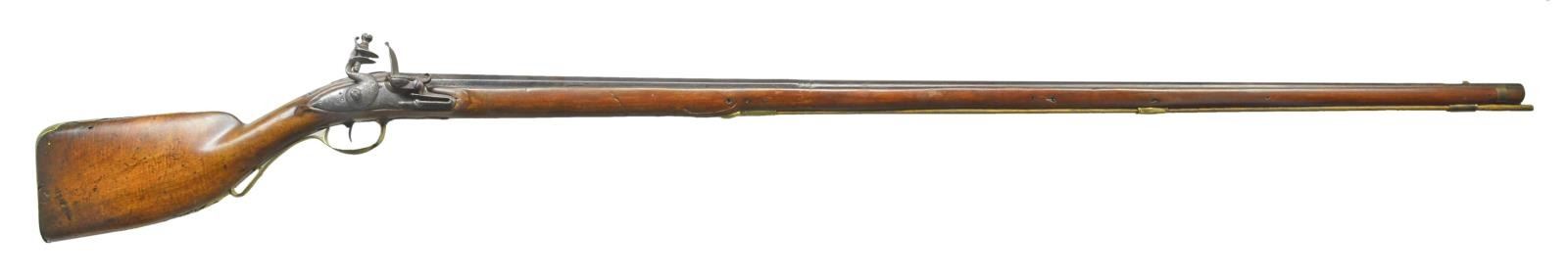 Cal. 72. NSN. The 54 1/4" bbl. transitions from oct. to rnd. through relief engraved wedding band. There is an indecipherable maker's mark on left rear flat. Bbl. has brass front sight & filed in sighting groove on tang. Rnd. bodied lock w/ serpentine cock, inset semi-water proof pan, bridled friction frizzen & feather spring w/ long dbl. bodied bulbous finial has indecipherable mark on tail. Full length stock of dense, lightly figured European walnut is brass mounted & has raised carved acanthus around bbl. tang & behind thimble. There are also raised mouldings & drop points around lock & fancy triangular sideplate. Trigger guard & buttplate have deep relief scroll & acanthus chasing & have fancy outlines. Sideplate has punch dot "engraving". Hard wood ramrod is held by 2 beaded pipes & matching thimble. CONDITION: good, iron parts w/ dark brown to black patina w/ scattered pitting. Brass once cleaned is toned to an attractive gold color. Stock retains most of an old finish over some marks & has a few subsequent scratches & recolor to repairs along bbl. channel. Fair to good bore. Lock is operable, mainspring weak. The hammer sometimes drops to the half cock position. PROVENANCE: From the Collection of James B. Taylor. (01-20545/MGM). ANTIQUE. $2,500-3,500.