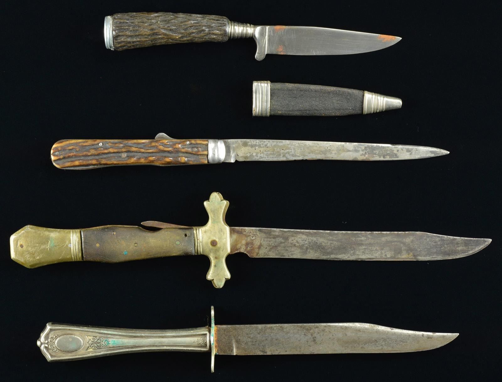 3) SHEFFIELD ENGLAND FIXED BLADE KNIFE. Overall; 12 1/4". Blade marked "CUTLERY / SHEFIELD / ENGLAND". Nickel silver appearing handle & hilt. CONDITION: fair appearance overall w/ patina, light pitting & marks.