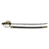 Overall length: 35". Blade length: 28". This grenadier saber appears to be from the late 18th century to the early 19th century. It is likely of French origin but may be from a neighboring country. Blade has a wide fuller with a secondary fuller near the spine. The blade is etched over the first 7 3/4" with foliate designs, a goddess, a spray of arms, and the motto "UNITAS & LIBERTAS". Brass hilt with a modified 4-slot counter guard & large semi-basket guard featuring a central flaming bomb with 3 fleur de lys. Plain knuckle bow with a plumed helmet pommel above a plain backstrap. Leather wrapped grip. Brass mounted leather scabbard. CONDITION: blade has a medium gray mottled patina. Hilt has a pleasing mustard patina with some verdigris. Grip is about 90% complete with a few period repairs. Scabbard mounts have a pleasing mustard patina; however, the bottom mount may be replaced. Leather body is a bit flaked and somewhat flexed. (02-20081/BF). $700-1,200.