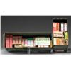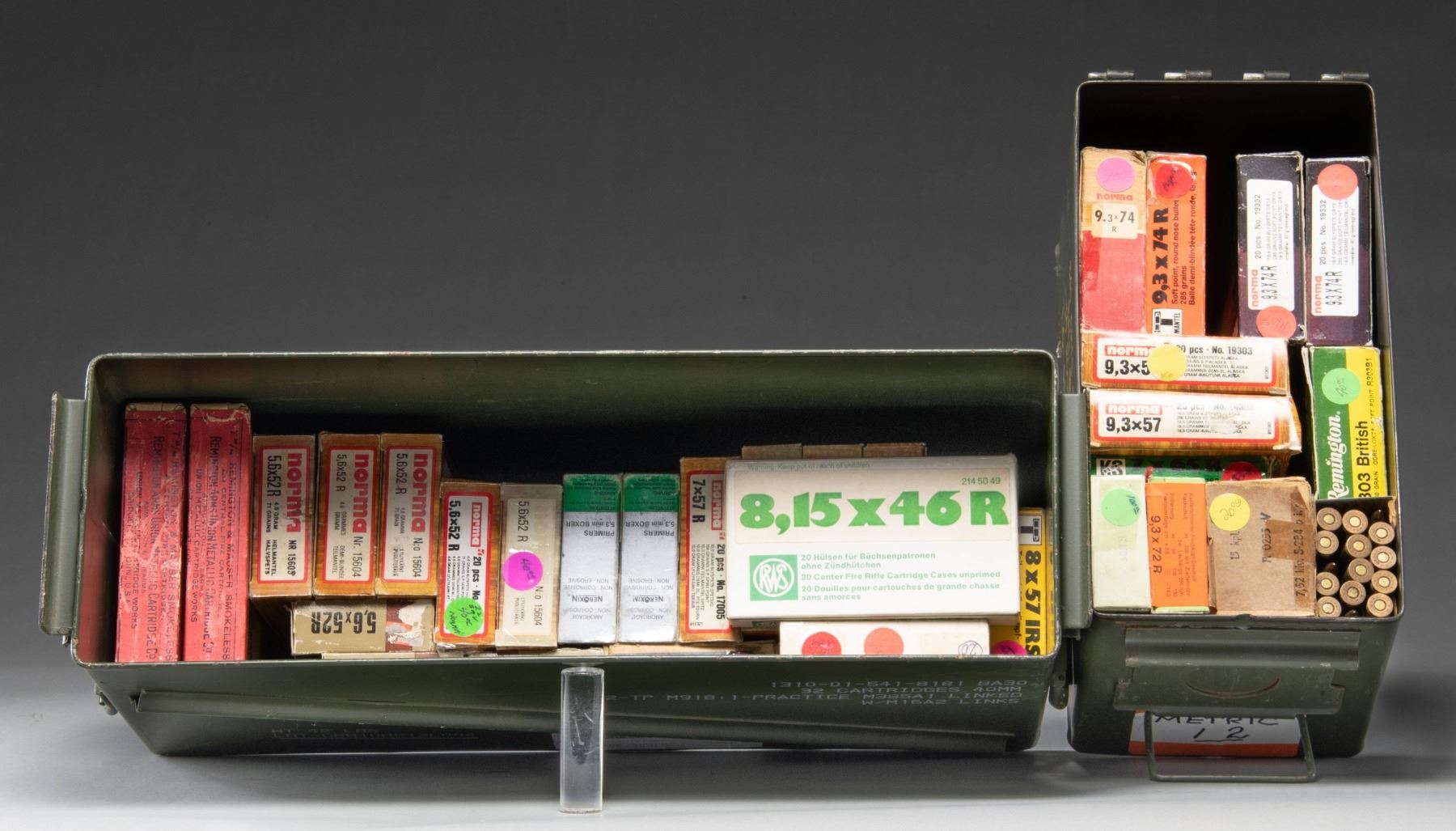 All good serviceable ammo unless noted. In 20 round boxes unless noted. Rimless ammo listed last. Partial boxes have count listed within parenthesis. Includes 1 GI style 50 cal. can and 1 double latch 40mm can. RIMMED AMMO: 2 RWS 9.3X72R in 10 round boxes; 193 grain JSP FN bullets. / 3 Norma 9.3X74R; 2 with 285 grain Oryx SP bullets and 1 with 286 grain SP RN bullets. / 1 RWS 9.3X74R with 285 grain SP RN bullets. / 1 DWM 8X65R in 10 round box with JSP RN bullets. / 1 RWS 7X65R #301R with 162 grain Jacketed Pointed SP bullets. / 1 Remington 303 British R303B1 with 180 grain Core-Lokt SP bullets. / 1 (19 rounds) RWS 8X57IRS with 196 grain SP RN bullets. / 1 Sellier & Bellot 8X57JR #2941 with 196 grain SP bullets. / 1 (full 15 rounds) Finnish 7.62X54R marked "VPT 44" with FMJ bullets. / 2 Sellier & Bellot 7X57R with 173 grain #2932 SPCE JSP bullets. / 2 Norma 7X57R with 154 grain SP Spire Point bullets. / 3 (57 rounds) Sellier & Bellot 5.6X52R (22 Savage Hi-Power) with 70 grain SP bullets. / 4 Norma 5.56X52R #15604 with 71 grain SP bullets. / 1 (17 rounds) Norma 5.56X52R #15605 with 71 grain FMJ bullets. / RIMLESS AMMO: 2 Norma 9.3X57 with 286 grain SP Alaska bullets. / 3 (26 rounds) 10 round boxes of 8X56 MS with JSP RN bullets. / 1 (10 round box) DWM 8X56 MS with JSP RN bullets. / 1 Western 8X56 MS M1908 with 200 grain SP Lubaloy bullets. 1 (full 15 rounds) Military 7.65 Argentine Mauser dated 1943 with FMJ bullets. / 1 Norma #17701 of 7.65 Argentine Mauser with 150 grain Semi-Pointed SP bullets. / 1 Norma 7.5X55 Swiss #17511 with 180 grain Soft Point Semi-Pointed BT bullets. 1 (full 50 round box) Spanish 7X57 Military dated 1942 with 175 grain FMJ bullets. / 2 Remington vintage red topped 2 piece boxes of 7mm Mauser with 175 grain FMJ bullets; casings have random black staining and very good boxes. / NEW EMPTY BRASS CASES: 1 RCBS Basic. / 1 RWS 8.15X46R. (02-25258-2?NW). $550-800.