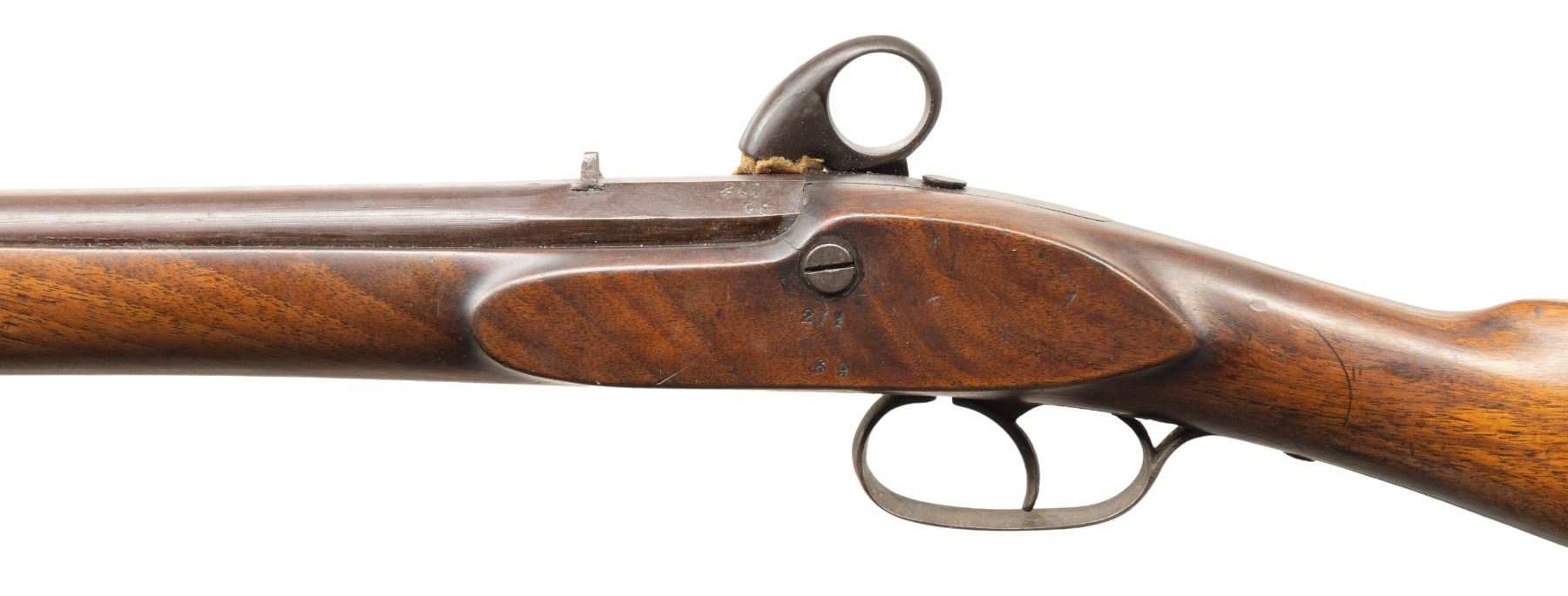 Cal. 58. NSN. Bbl. 31 1/4" rnd. Brass blade front sight. Fixed v-notch rear sight. European ring hammer percussion rifle that appears similar to the Danish model 1849 pistol. Lock appears to be marked with crown "CP" proof. Rear of bbl. & left rear of stock both marked "211/69". Walnut stock set with later White Line rubber buttpad. Replacement button tipped ramrod secured by one thimble & iron pipe. CONDITION: stock appears sanded with some staining, light chipping, handling marks, small crack ahead of stock bolt, scattered handling marks & dings. Buttpad shows heavy deterioration & cracking. Metal is a dull gray patina with some pitting more heavy at rear of bbl. near nipple, scattered oxidation, handling wear & edge wear. Action appears functional when hand cycled. Bore shows pitting along its length but strong rifling. PROVENANCE: Estate of Groves Herrick. (01-28321/MJC). ANTIQUE. $300-500.