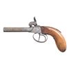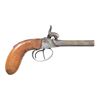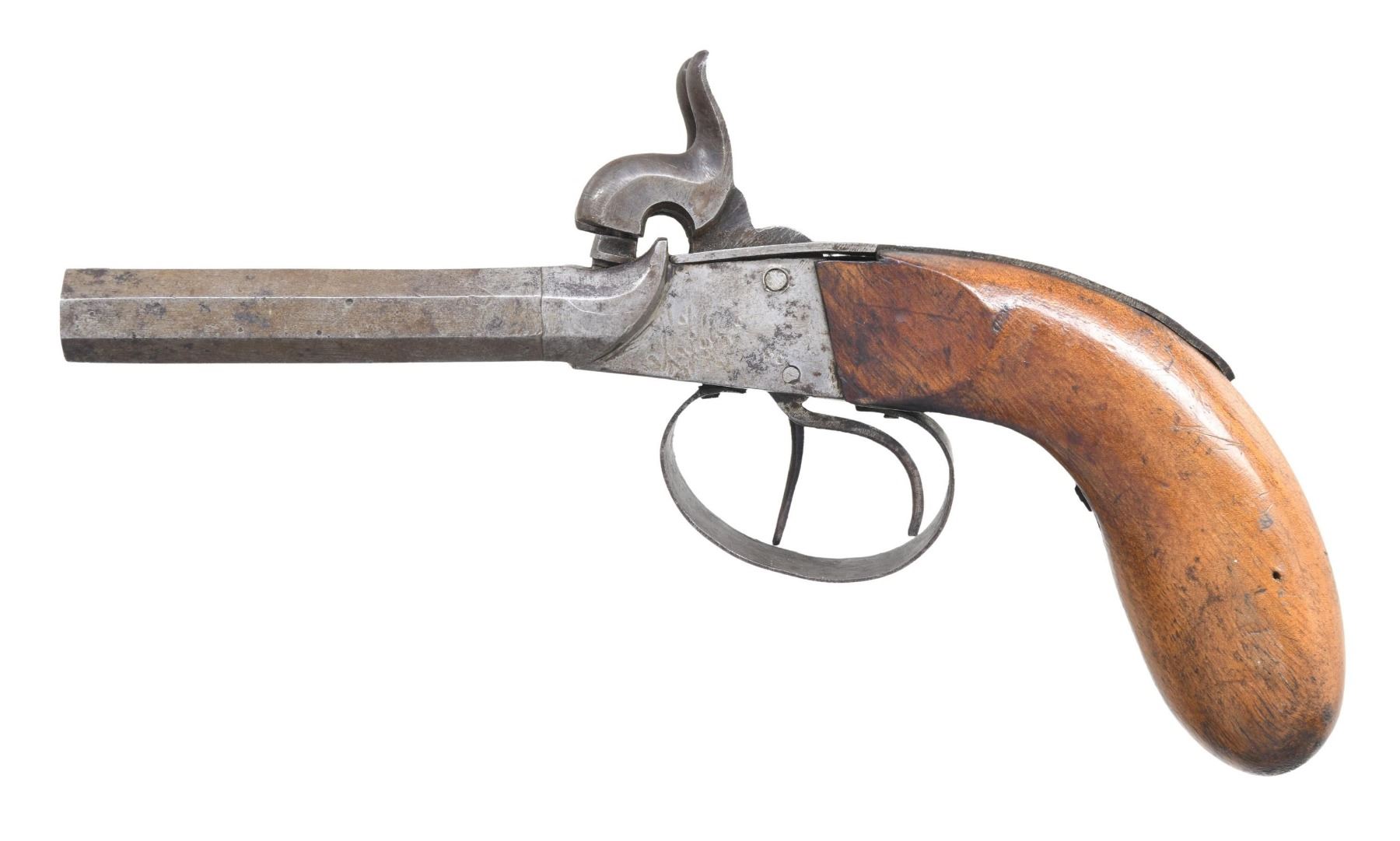 Cal. 40. NSN. Bbls. 3". Percussion side by side pistol with double triggers & hammers. Left trigger appears different that right with a more notable curve. Bottoms of both bbls. marked "XI". Pistol otherwise appears unmarked. Hardwood grip. CONDITION: grip appears sanded with upper tang being proud of wood. Grip shows scattered dings, chipping & handling wear. Metal is a light gray color with scattered oxidation, pitting & dings. Action is sluggish but appears functional when hand cycled. Pitted bores. (01-26156/MJC). ANTIQUE. $150-250.