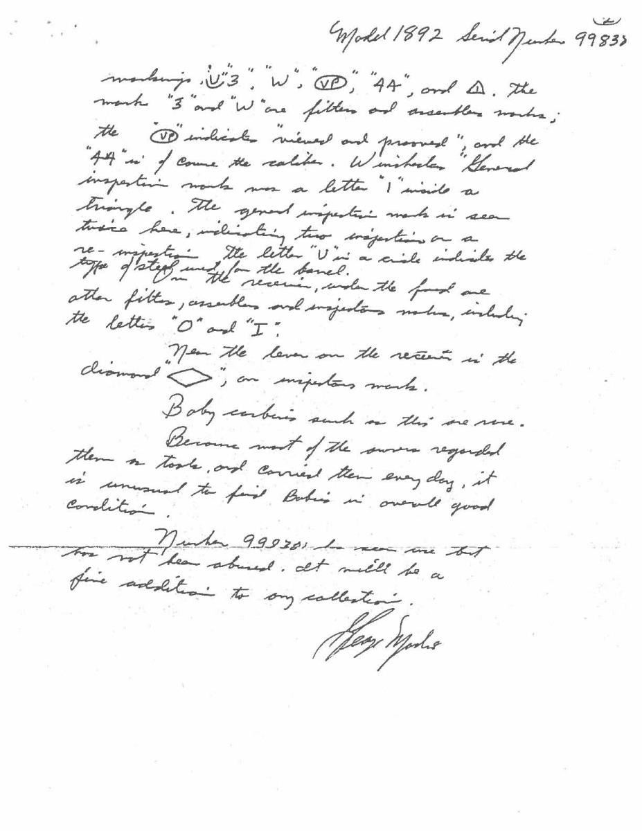 WINCHESTER MODEL 92 TRAPPER LEVER ACTION CARBINE. Cal. 44 WCF (44-40). S# 998381. Bbl. 15’’ w/ pinned blade front sight & carbine leaf rear sight. Full length mag. Correct 7-7/8’’ trapper length forearm. Gumwood stock w/ steel carbine buttplate. Left side of action has staple attached saddle ring w/ leather thong. Mfg. 1929. UNATTACHED ACCESSORIES: Bureau of Alcohol, Tobacco & Firearms letter to Mr. George Madis dated 1/8/1997. Letter confirms this rifle as being defined as a “curio or relic”. Also included is a copy of a 2 page letter from George Madis detailing the carbine & asking for its exemption. A Doug Turnbull Restoration Inc. invoice dated 6/6/97 shows the cost of restoration to be $4,575. CONDITION: near excellent as expertly restored retaining over 99% bluel. Wood shows small scratches. Forearm is slightly undersized at action showing very small chips on left side. Bore is generally bright showing scattered very light pitting. PROVENANCE: Ex. George Madis Collection. (23-8/DS). CURIO. $6,000-9,000.